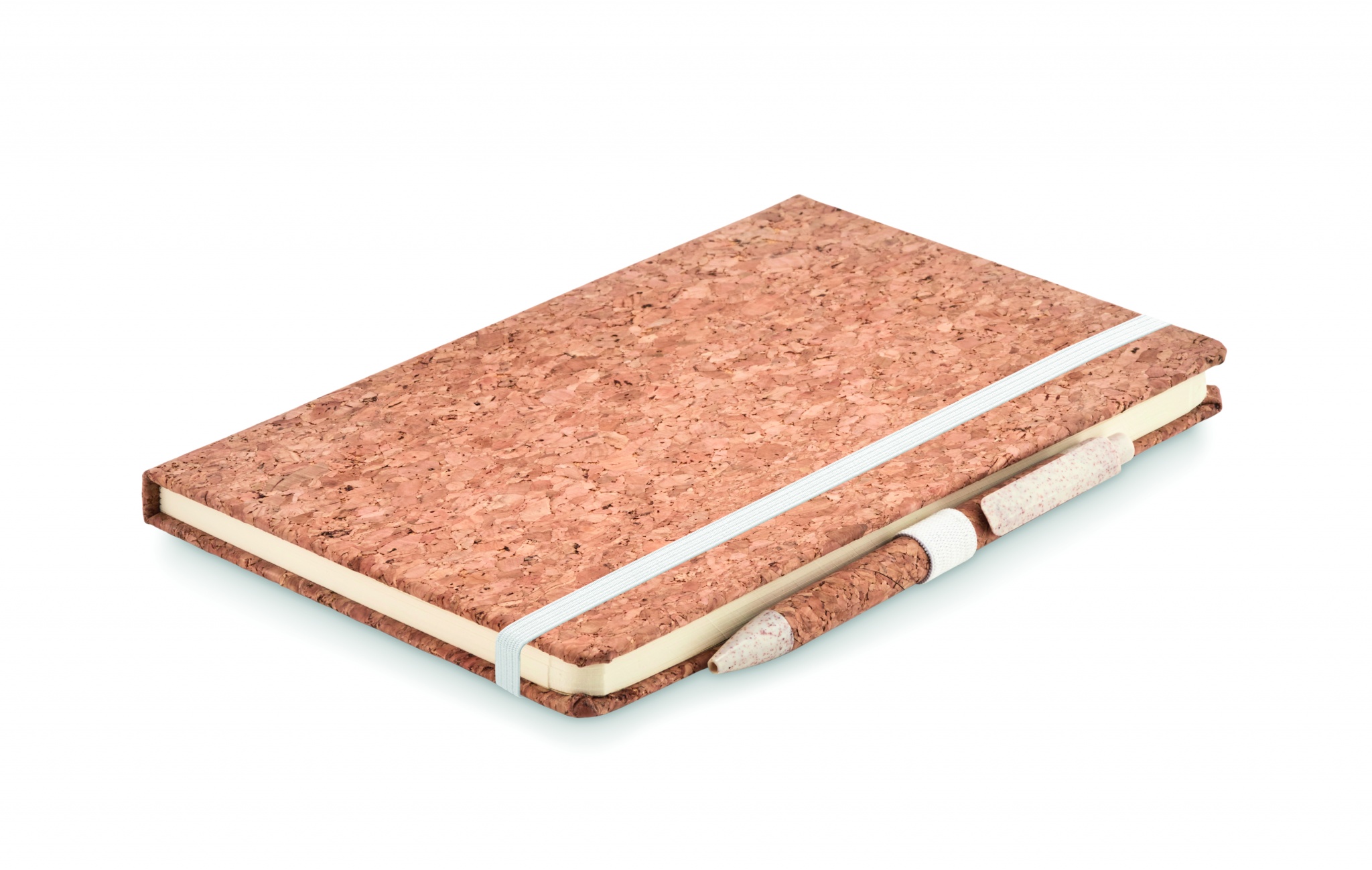 DIN A5 Notizbuch mit Cover aus Kork. 96 Blatt (192 Seiten) liniertes Papier. Druckkugelschreiber mit Korkschaft, Clip, Drücker und Spitze aus 50% Weizenstroh und 50% PP. Elastisches Verschlussband und Stiftschlaufe. Lieferung in einer Box aus Kraftpapier. Kork ist ein 100% natürliches Material. Aufgrund seiner strukturellen Beschaffenheit und Oberflächenporosität kann das endgültige Druckergebnis pro Artikel Abweichungen aufweisen.
