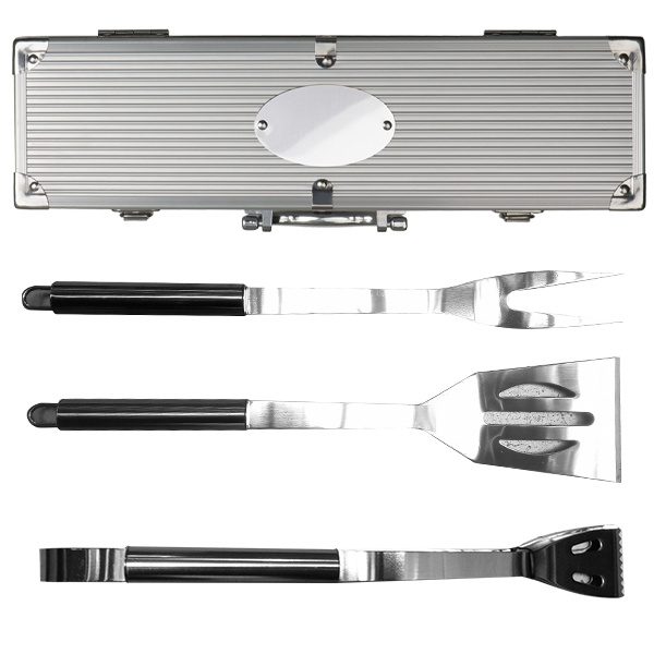 Grillkoffer bestehend aus Grillzange, Fleischgabel und Grillwender im Metallkoffer. Ihr Logo lasern wir auf die ovale Metallplatte des Koffers.