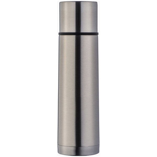 Edelstahl-Isolierflasche mit 500ml Füllvolumen und integriertem Becher im Deckel. Ihre Werbung wird eingraviert.