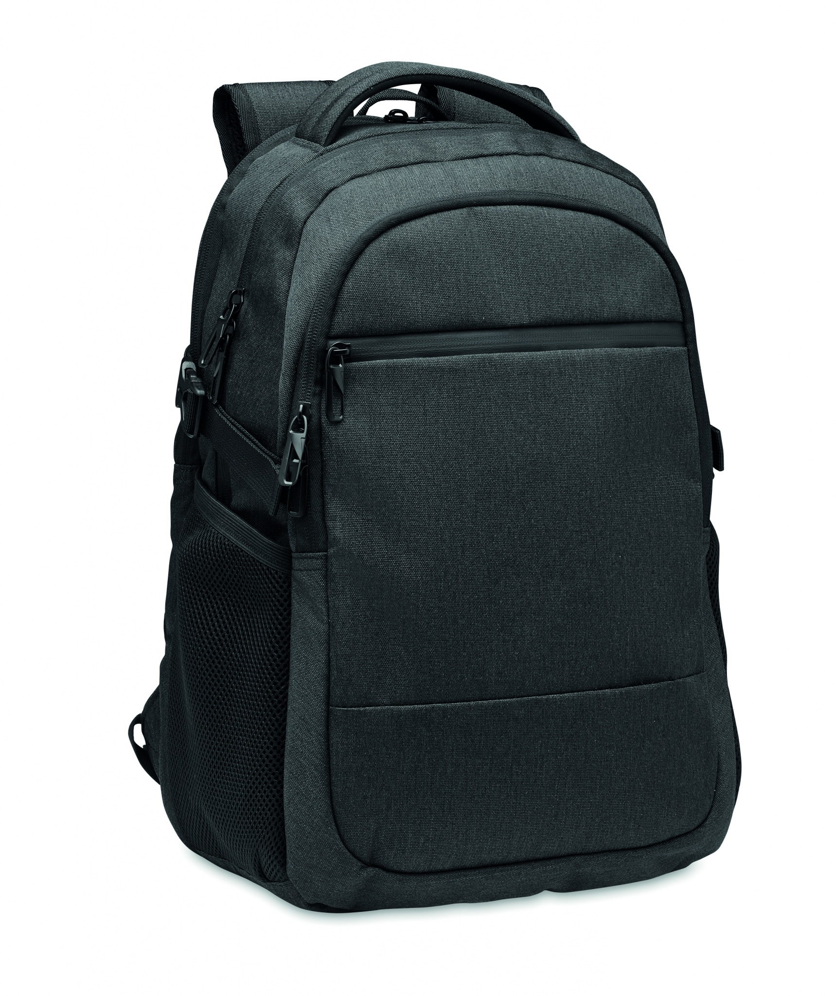 15'' Laptop-Rucksack aus 600D RPET Polyester. 3 Außenfächer mit Reißverschluss, vollständig gepolstert, mehrere Innentaschen, 2 seitliche Netztaschen. Verstellbare Schultergurte. Gepolsterter Mesh-Airflow Rücken. Trolley-Halterung.
