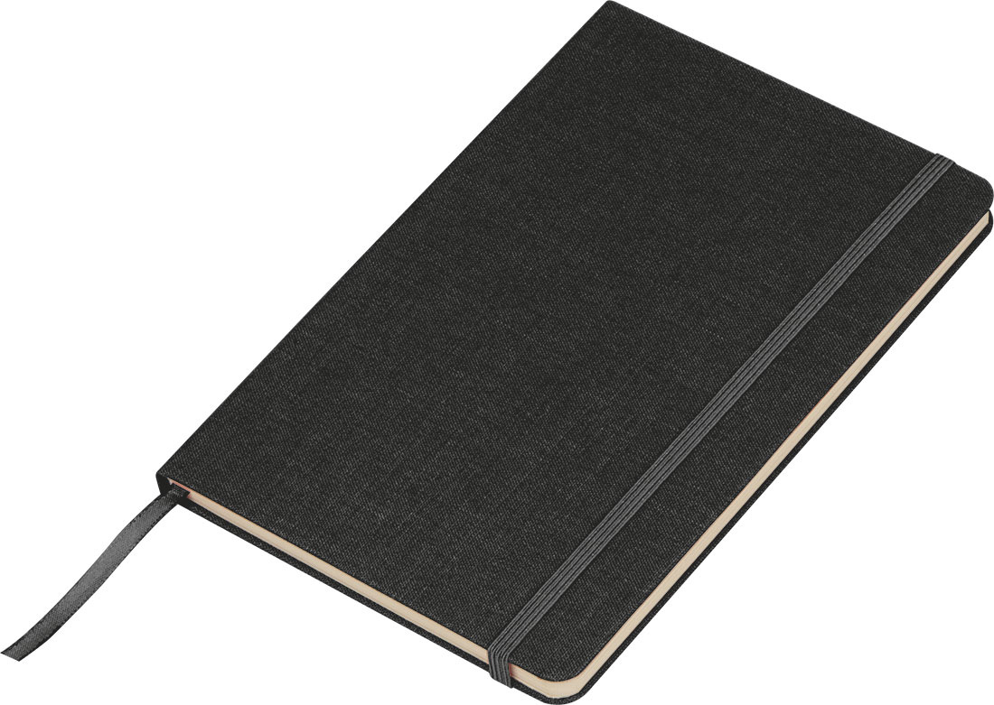 Nachhaltiges A5-Notizbuch mit gewebtem Einband aus recyceltem PET und 160 Seiten aus Zuckerrohrpapier. Außerdem verfügt es über ein Lesezeichen und ein elastisches Verschlussband.