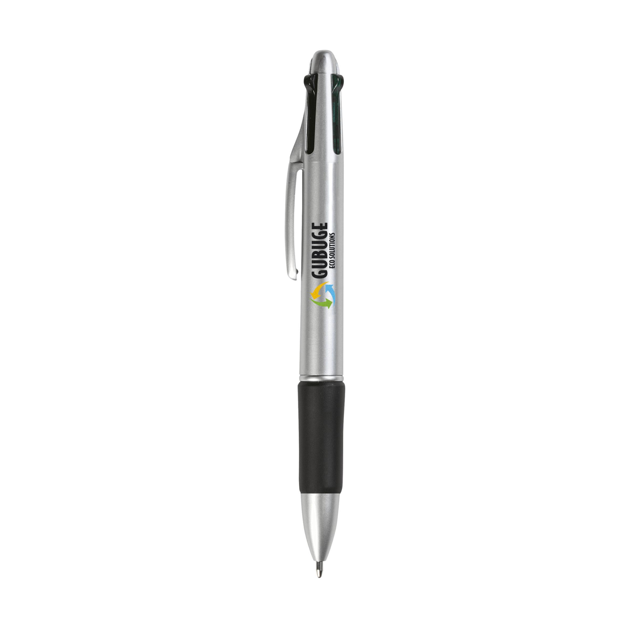 4-Farben-Kugelschreiber mit rutschfestem Gummigriff. Ausgestattet mit blauer, grüner, roter und schwarzer Tinte.