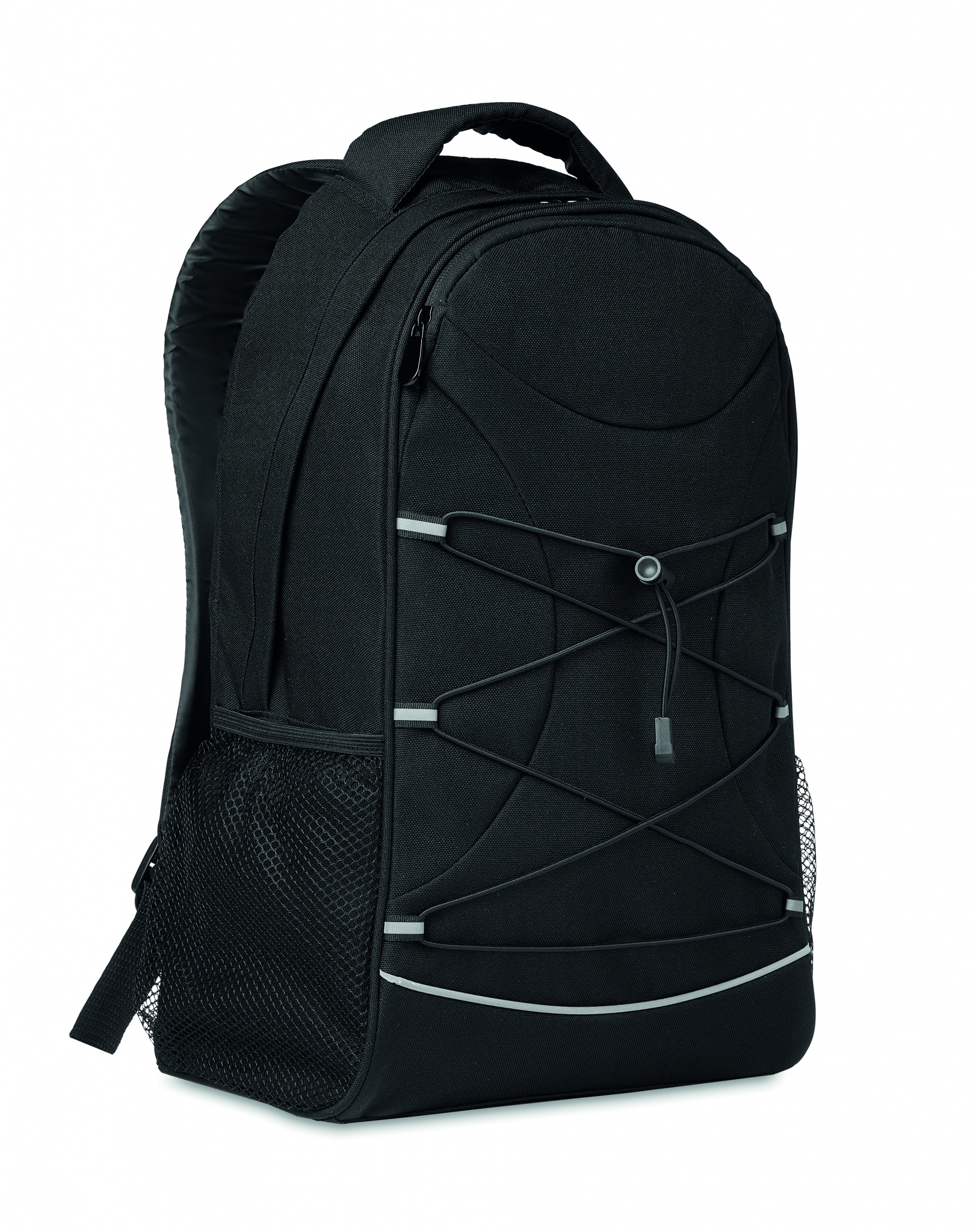Rucksack aus 600D RPET mit Schnürung auf der Vorderseite und reflektierenden Details. Netztaschen auf beiden Seiten.