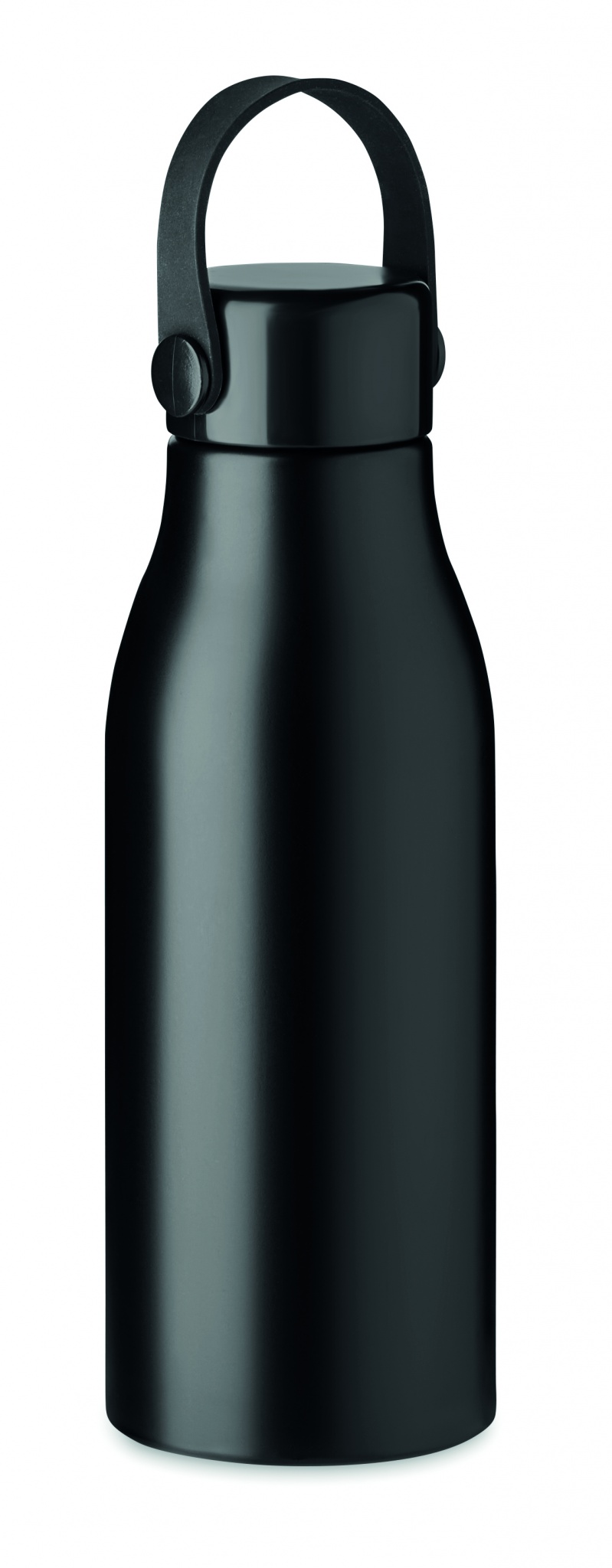 Einwandige Trinkflasche aus Aluminium mit Verschluss aus ABS und Silikon-Schlaufe. Füllmenge: 650 ml.