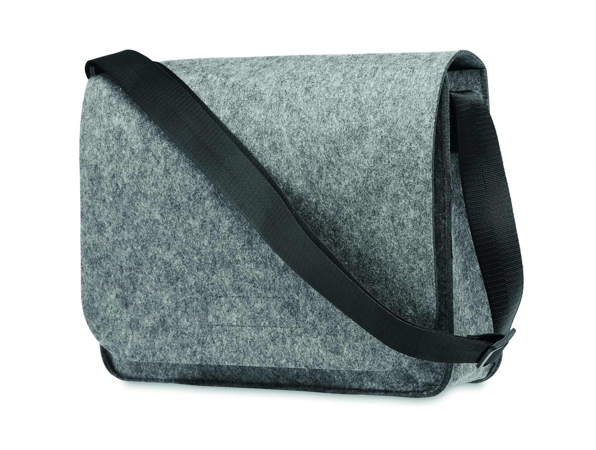 Umhängetasche aus RPET-Filz. Klettverschluss und Umhängegurt. Bietet Platz für einen 15'' Laptop.