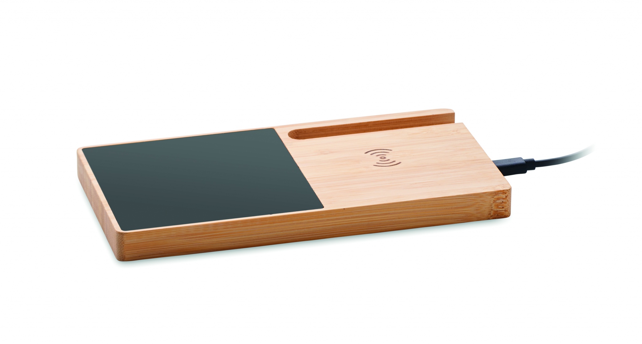 Wireless charger in bamboo including a mug warmer and phone stand. Connect device to your computer, place smartphone on it and allow it to charge. Output: DC 9V/1.67A (15W). Compatible with all QI enabled devices such as latest Androids, iPhone® 8, X and newer.
