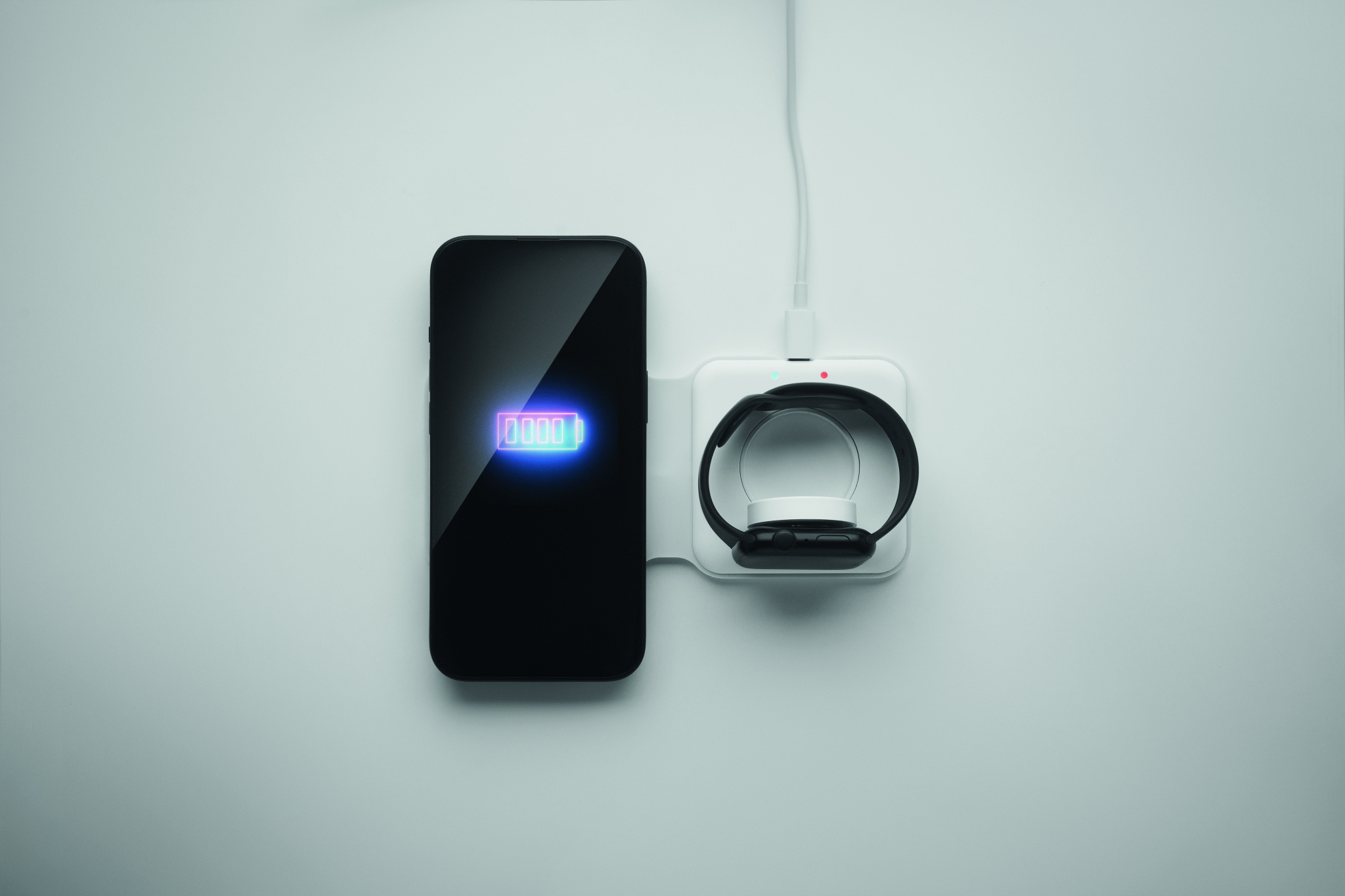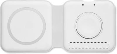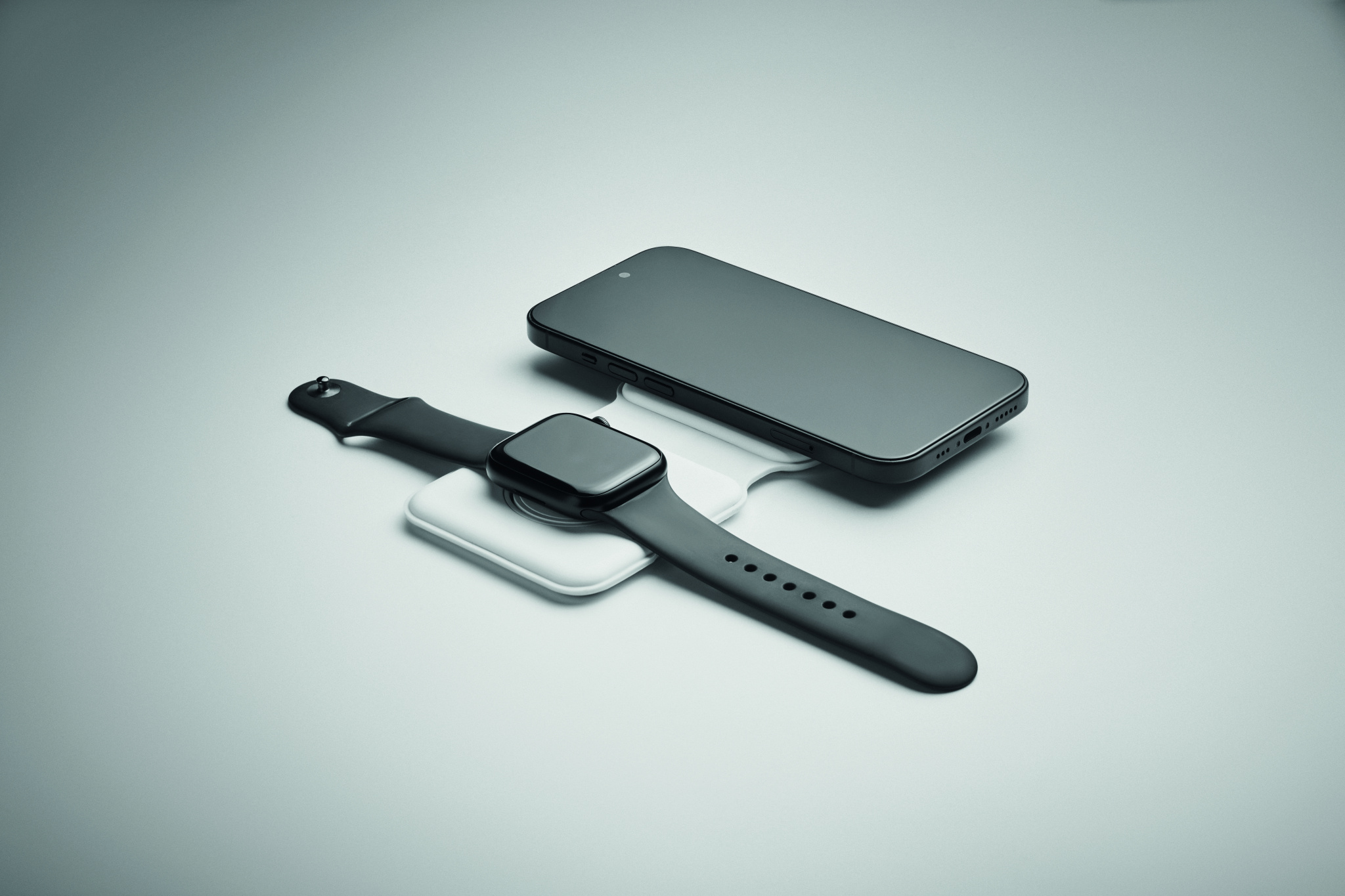 2 in 1 foldable charging station in ABS. It includes a wireless charger 15W and smartwatch charger (Apple®only).