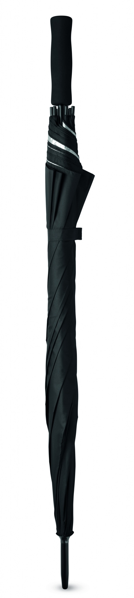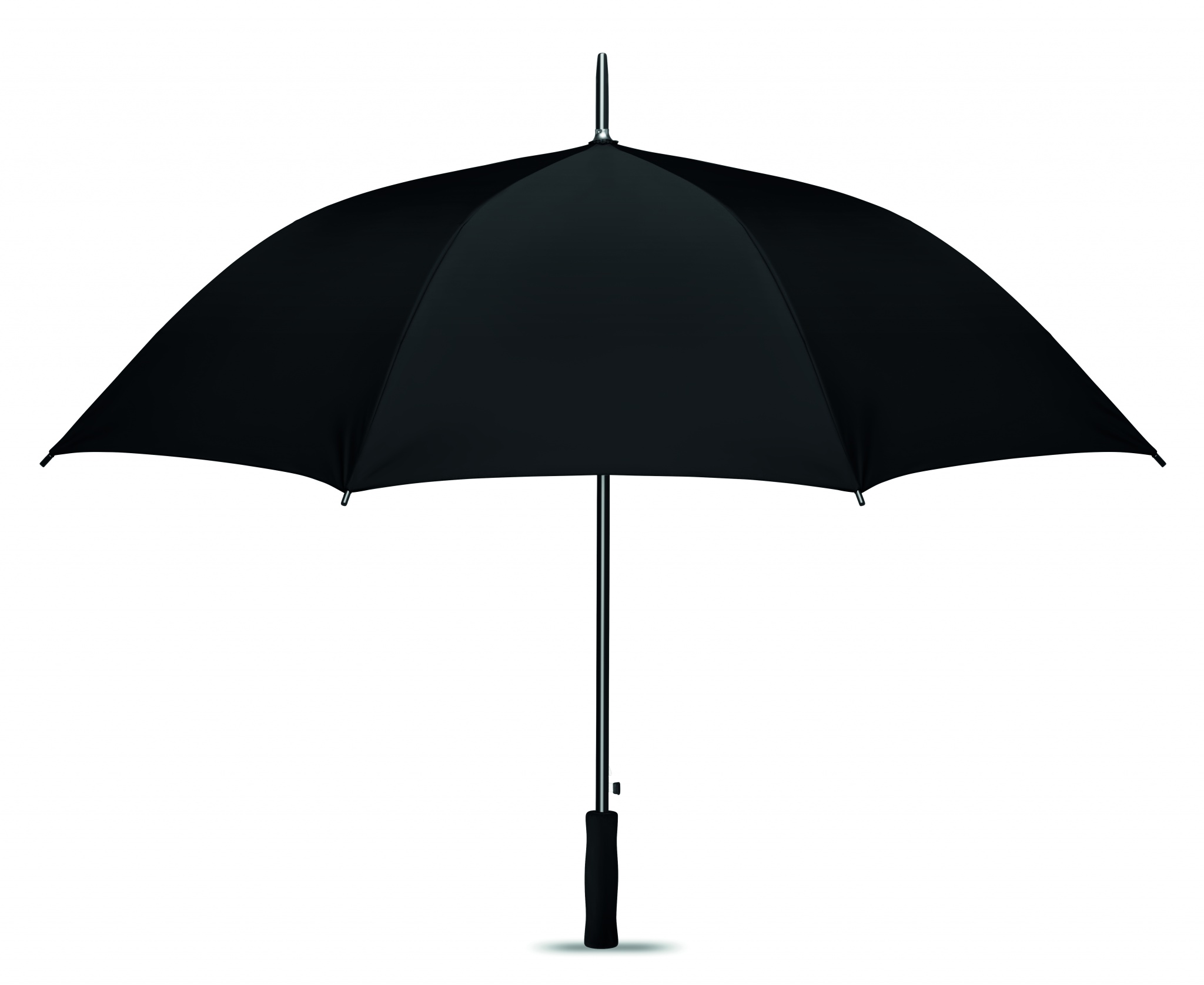 27 inch auto open umbrella in 190T polyester material and inside silver coating. With black plated metal shaft and ribs. Black plastic tips. Straight black EVA handle. Manual closure.
