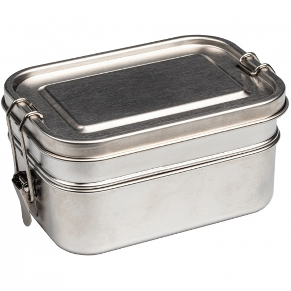 Double tier, durable, environmentally friendly and robust lunch box (bottom 700 ml capacity, top 450 ml capacity) made of stainless steel with a lid that can be closed with a clamp on both sides. Your logo will be engraved on the lid.