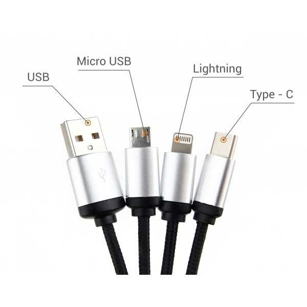 Cable for charging, includes 3 plugs: micro USB, lightning and type-C. Engraved logotype is enlightened when the cable is in use.