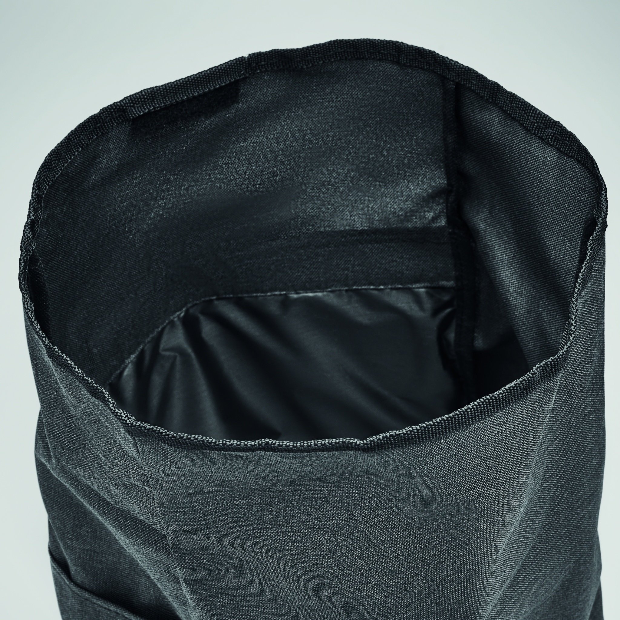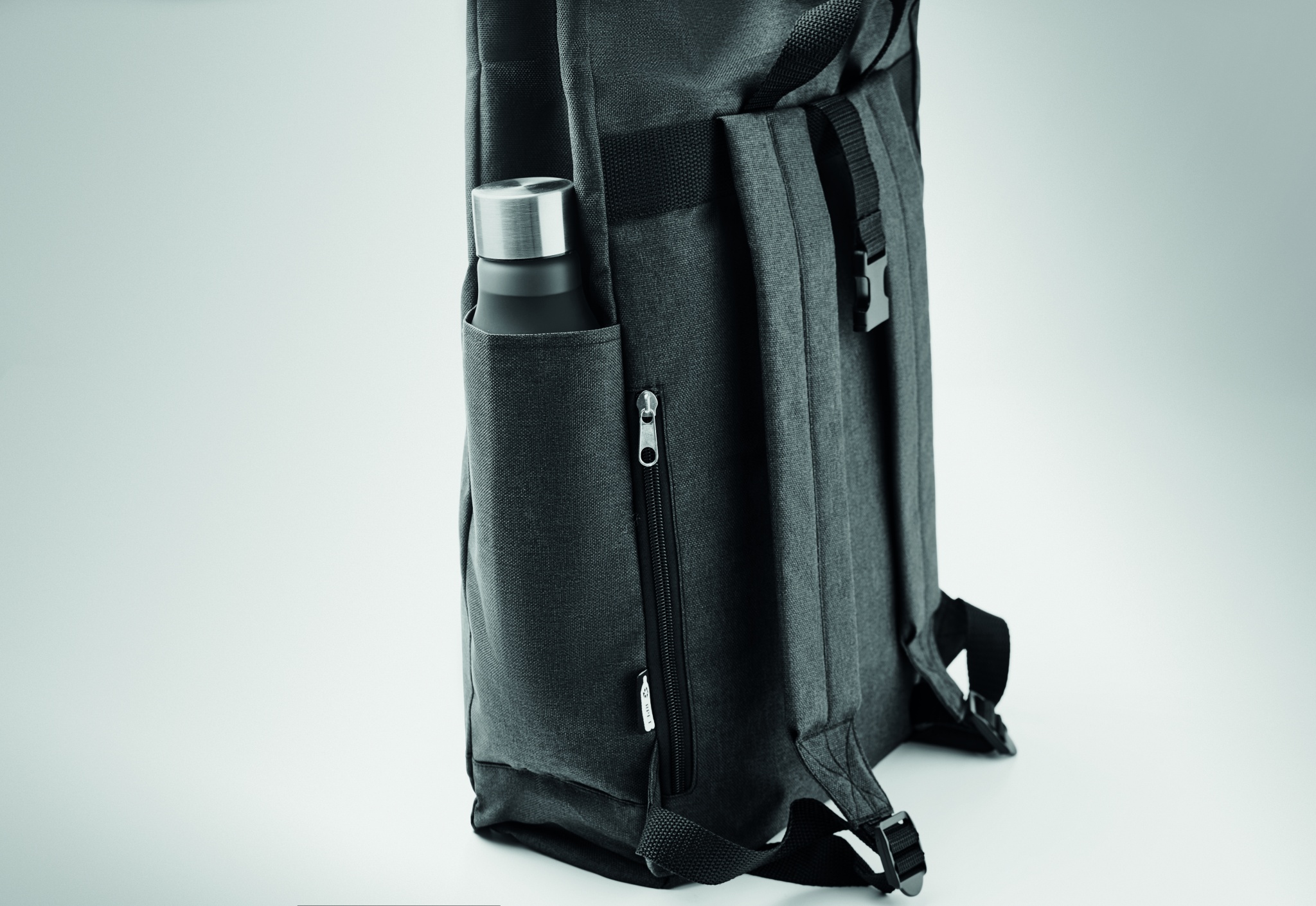 Backpack in 600D RPET 2 tone polyester with roll top closure.
