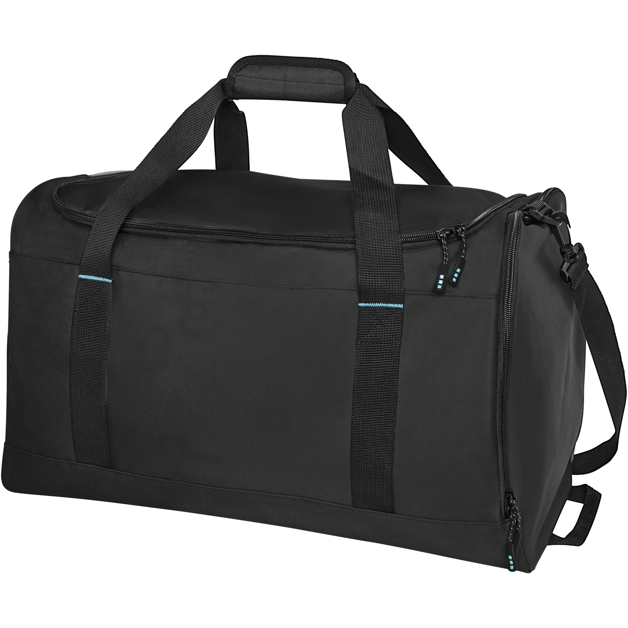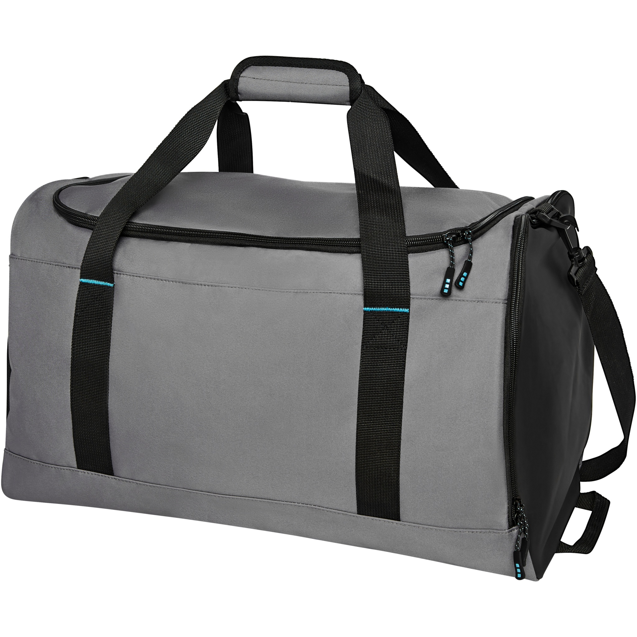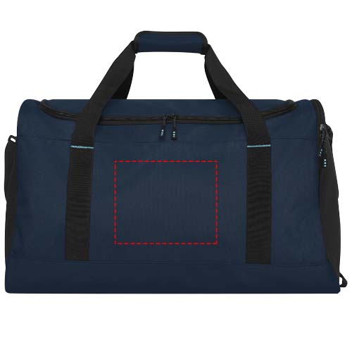 Sustainable GRS certified RPET duffel bag made with 55% recycled materials. Features a large zippered main compartment, a reinforced base panel, a side mesh pocket, and an expandable wet/dry zippered pocket. Comes with a small zippered internal pocket for organization, removable and padded shoulder strap, grab handles with padded velcro closure, and an extra grab handle on the bottom right side.