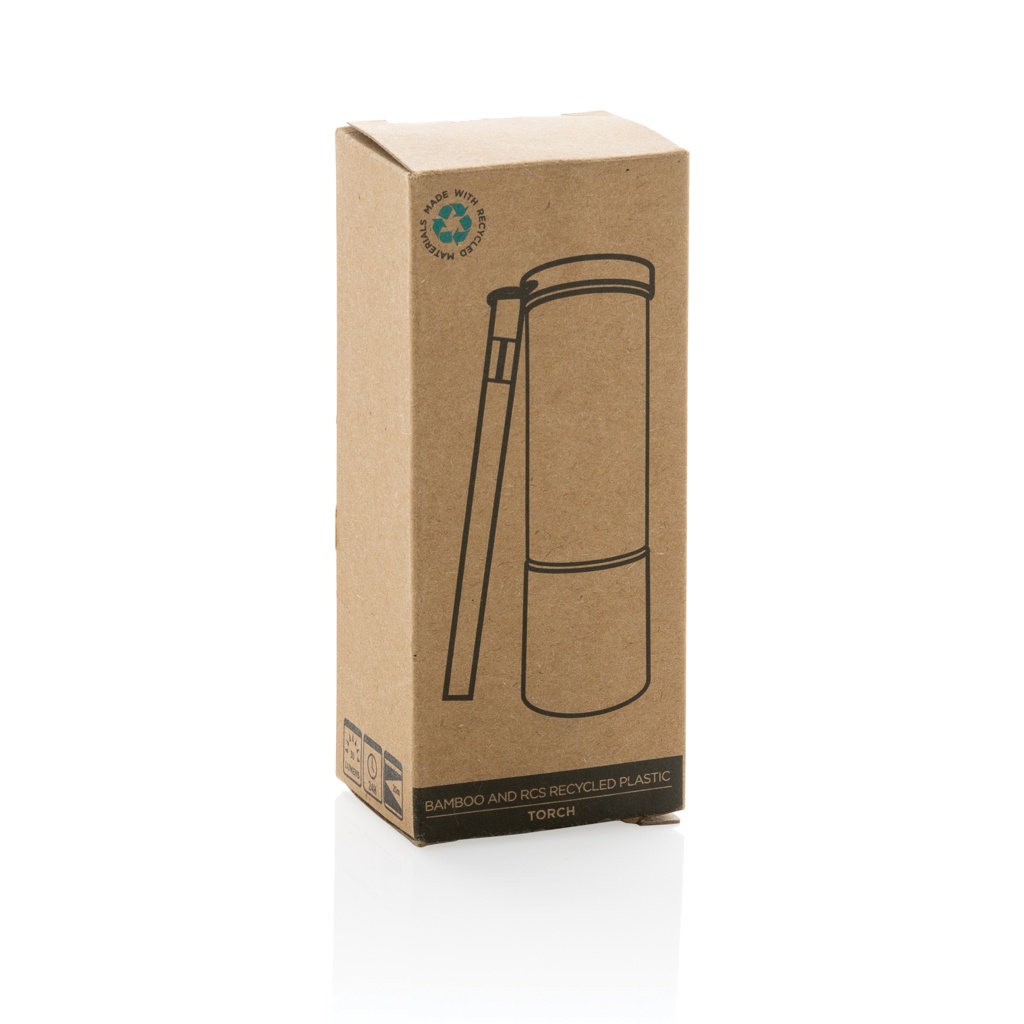 Pocket size torch made with FSC® 100% bamboo and RCS (Recycled Claim Standard) certified recycled ABS. Total recycled content: 36% based on total item weight. RCS certification ensures a completely certified supply chain of the recycled materials.. The beam distance is 20 metres and provides 30 lumen.Packed in FSC® mix kraft packaging. Item and accessories 100% PVC free. Including batteries.