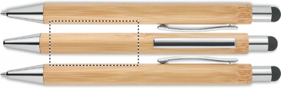 Push button ball pen in bamboo with stylus and shiny chrome fittings. Blue ink. Bamboo is a natural product, there may be slight variations in colour and size per item, which can affect the final decoration outcome.