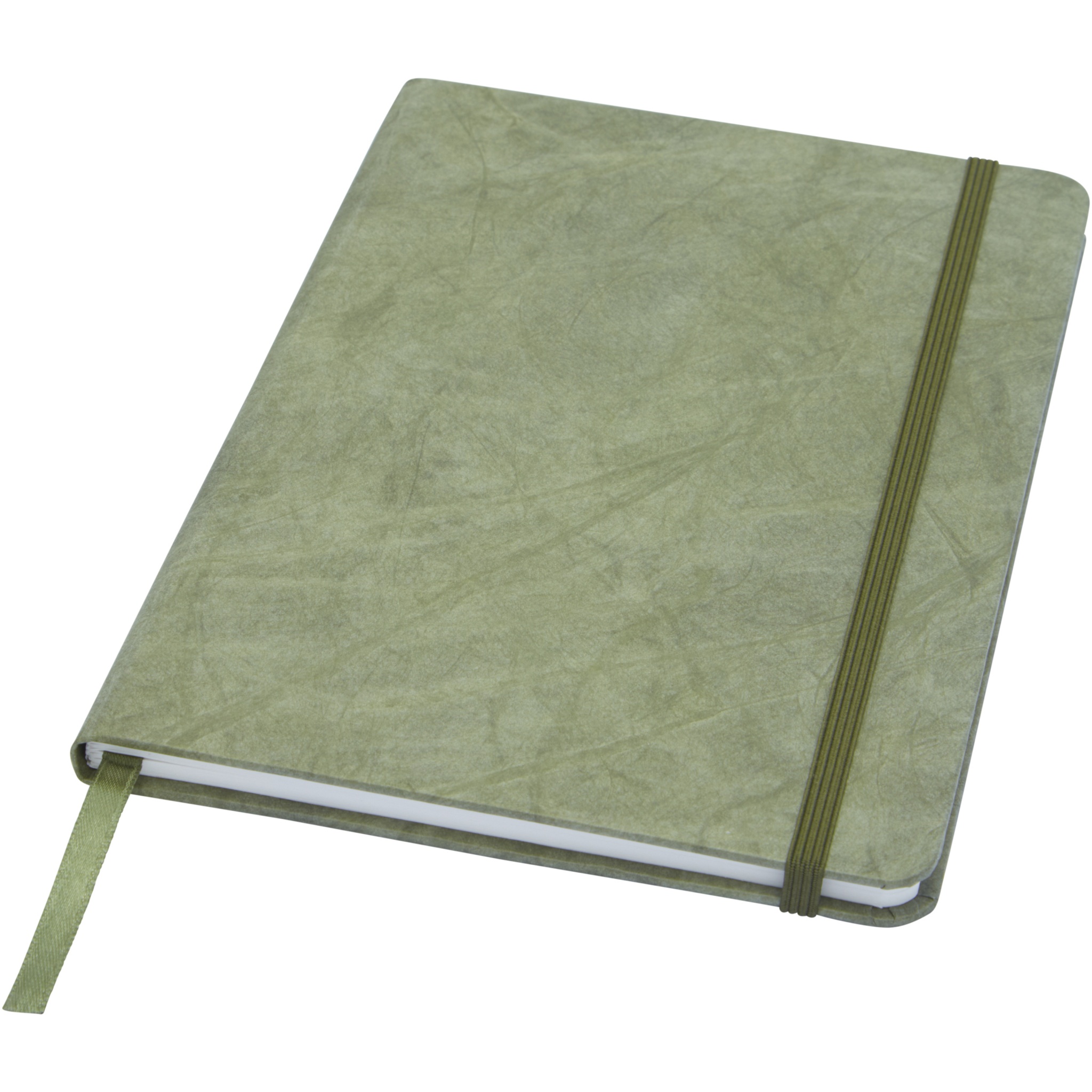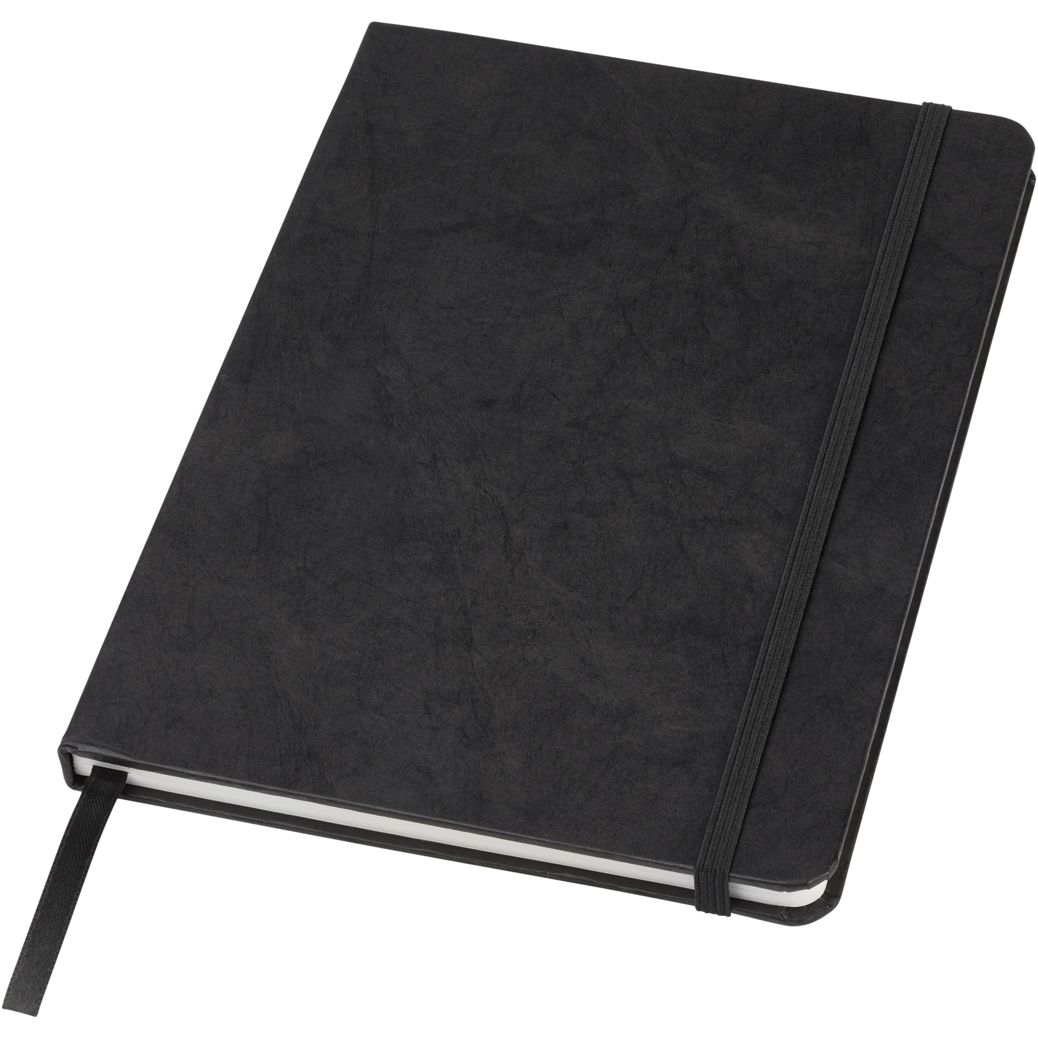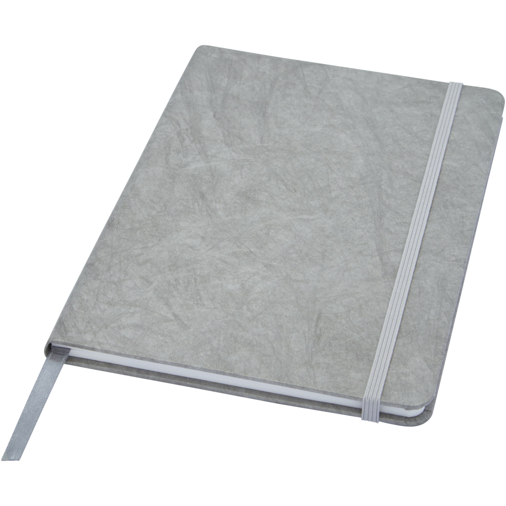 A5 size tear resistant notebook with inner pages made from stone. Stone paper is 100% tree free and the production process uses less energy compared to recycled or new pulp paper. It's water resistant so liquids spilled can easily be wiped off. Features a colour matching ribbon marker and elastic band and 60 sheets 120 g/m² lined stone paper. Packed in a cardboard sleeve.