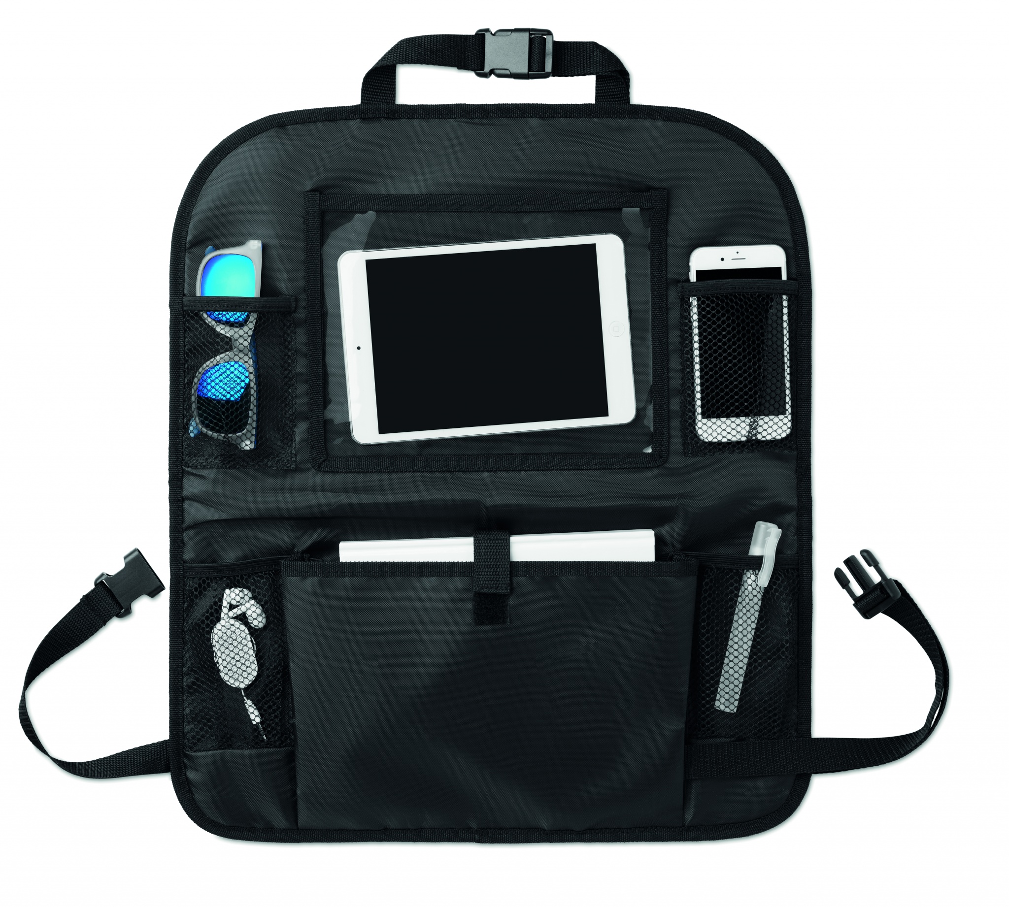Car organizer for the back of the seat with several compartments in 420D polyester.