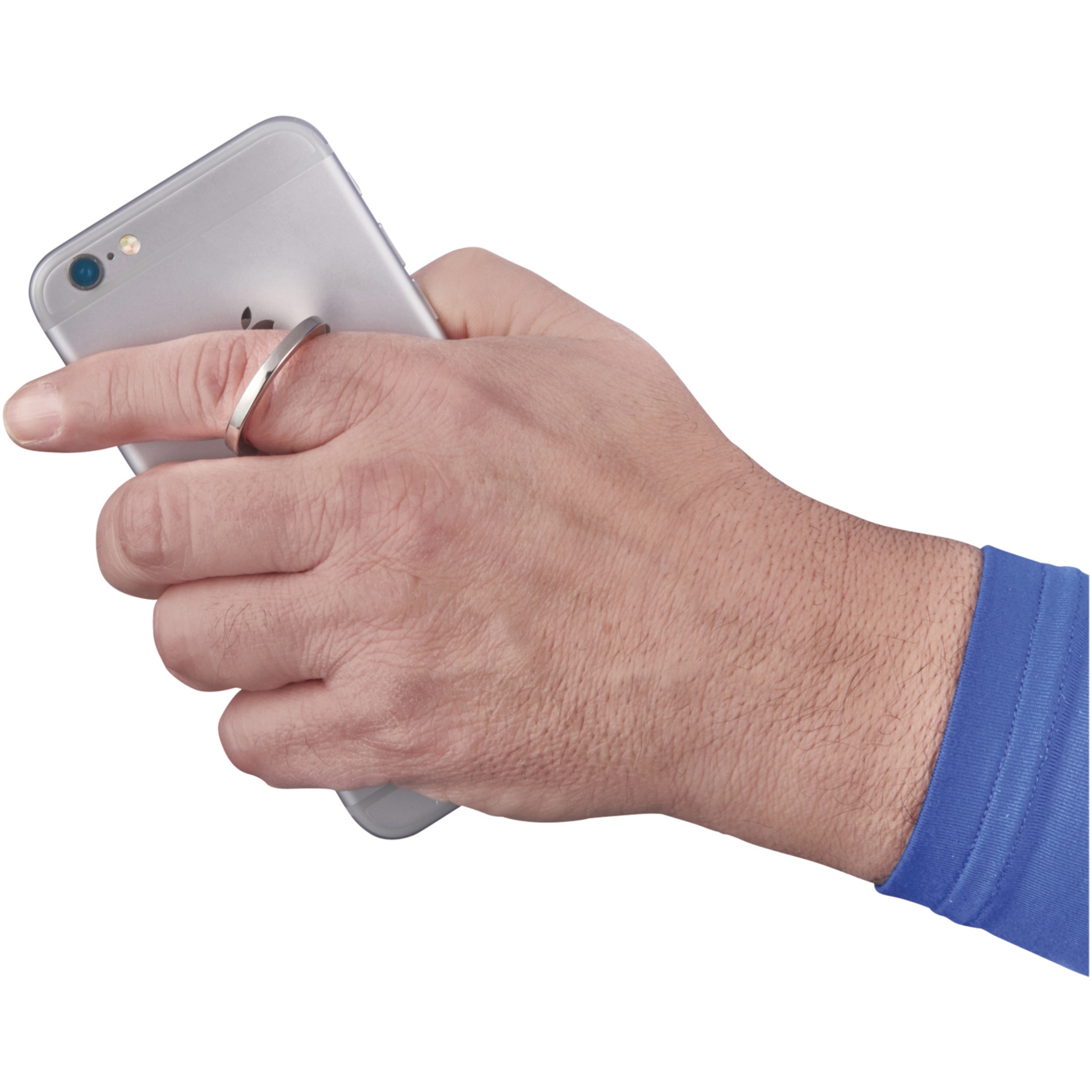 This aluminium ring can be lifted up to be used as a stand or to hold your device in your hand. Ring can be rotated 360 degrees. Adhesive backing attaches firmly to the back of a smartphone.