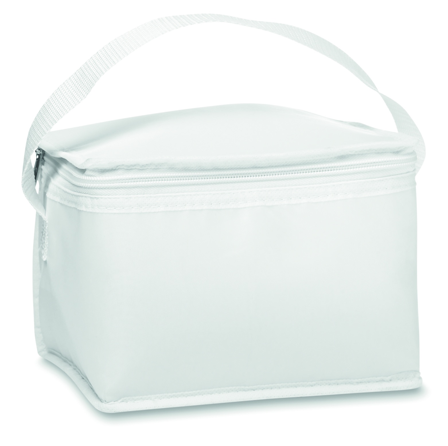 Cooler bag for 6 cans in 210 polyester. With non woven white trimmings. 80gr/m². Isolation material: foam laminated with aluminium foil. Capacity 3L.