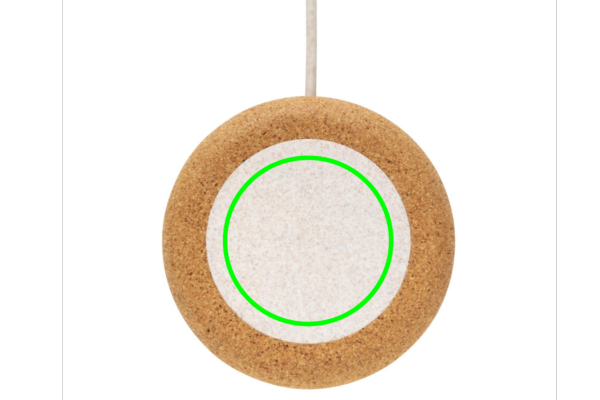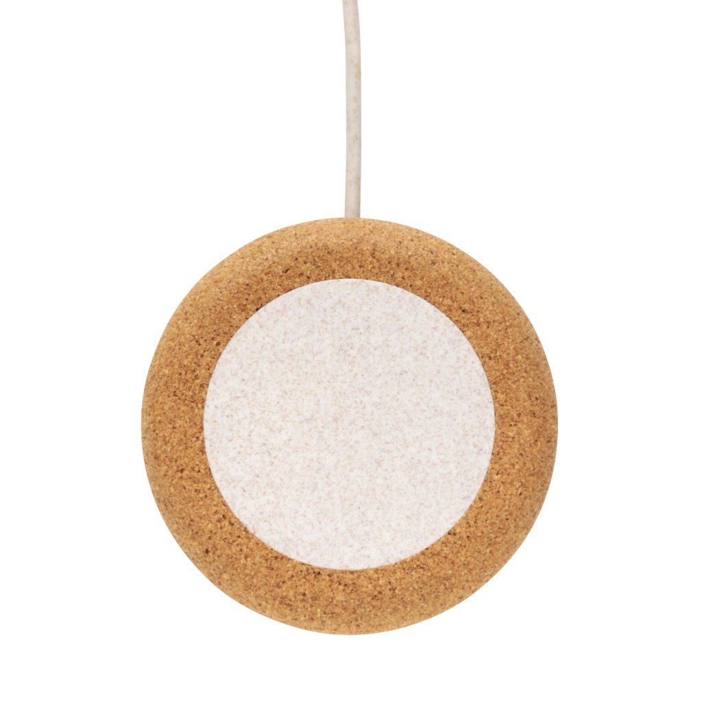 5W wireless charger with wheat straw (35%) mixed with ABS and natural cork. With integrated 120 cm wheat straw/tpe cable for direct use. Compatible with all QI enabled devices like Android latest generation, iPhone 8 and up. Input: 5V/2A; Output: 5/1A - 5W. Item and accessories 100% PVC free.