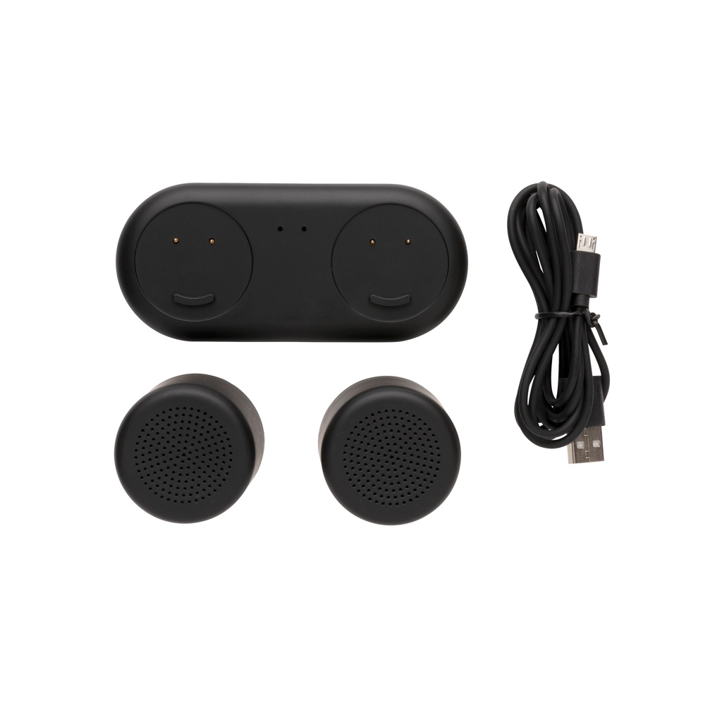 2X 3W speakers that can be paired for great stereo sound. Place the speakers anywhere you like for a great sound experience. The ABS speakers can be charged by simply placing them on the charging base. No need to connect any wires! Both speakers come equipped with a 300 mAh battery that allows a play time up to 2 hours. BT 4.2 for operating distance up to 10 metres. Including 120 cm micro USB cable to place the base on your desk or table.