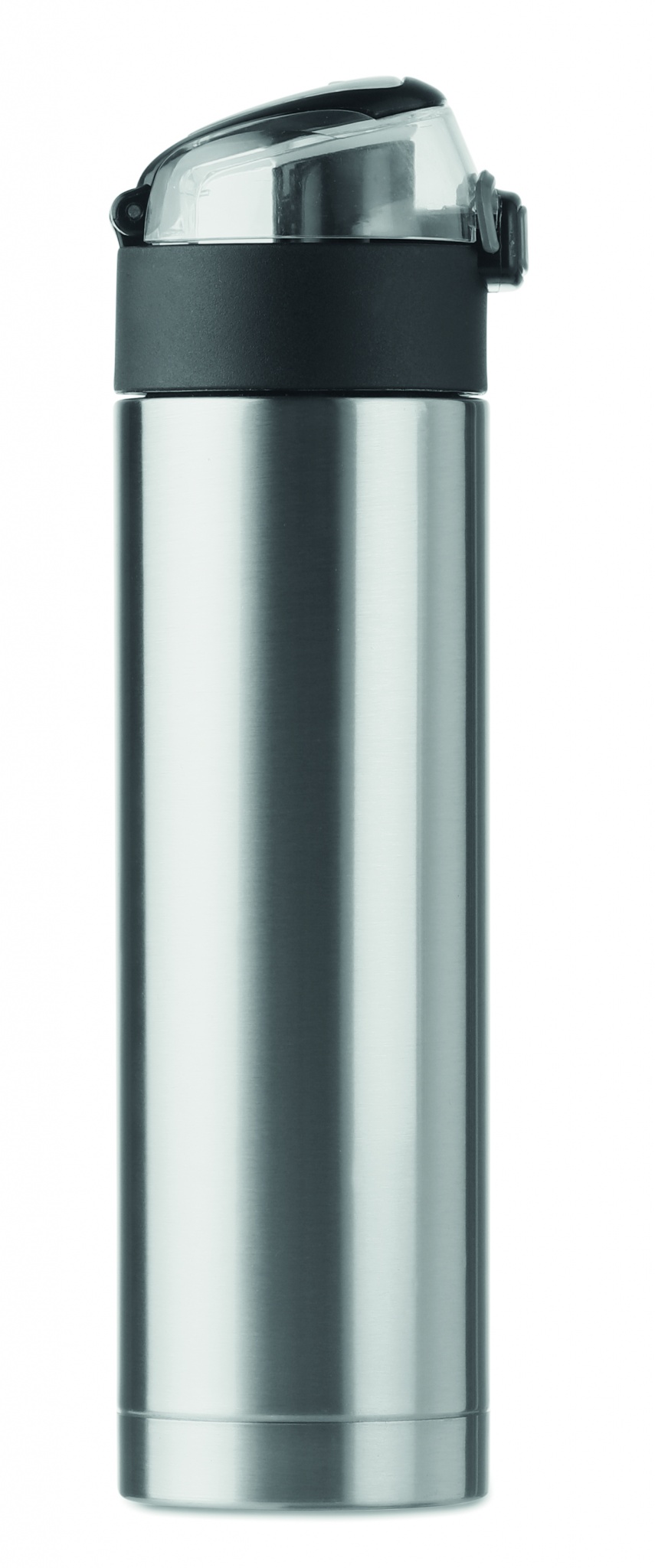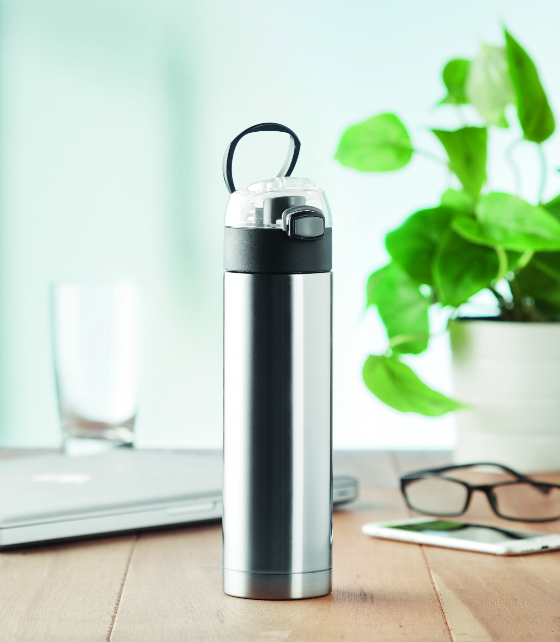 Double wall drinking bottle in stainless steel with security lock on the lid and press-to-open option. It has an easy carry foldable grip. 400 ml. Leak free. Leak free.
