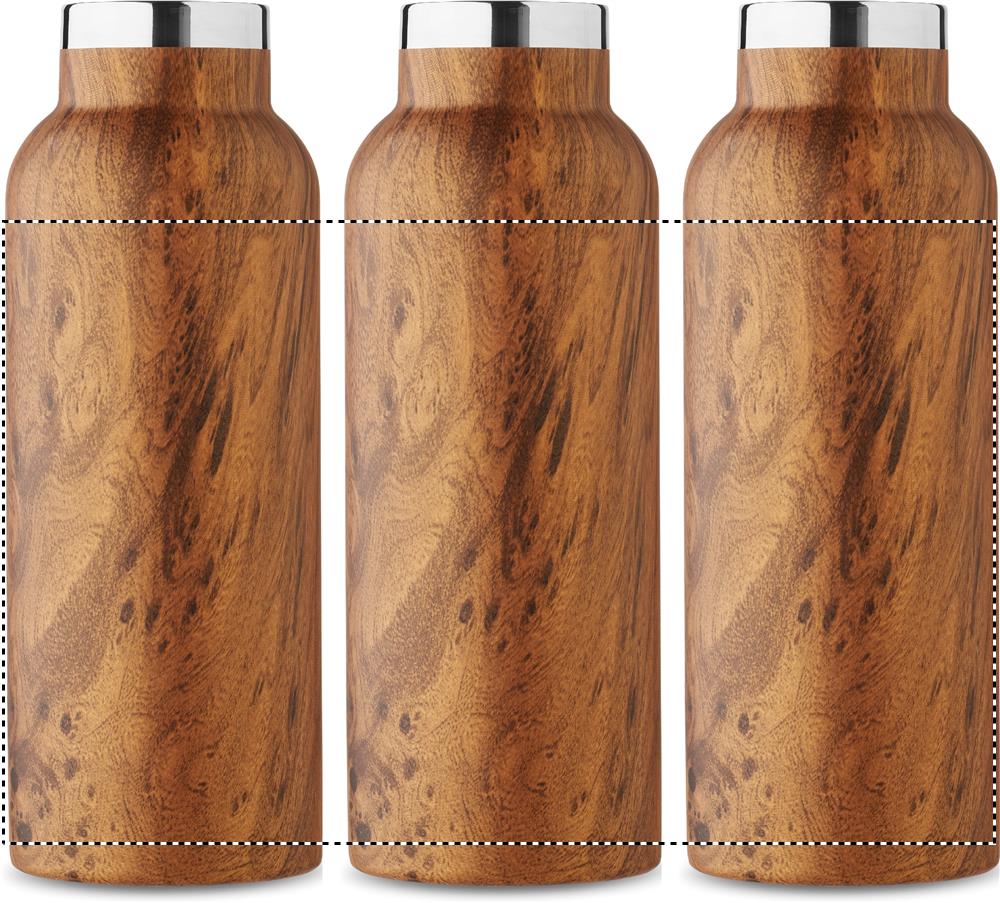 Double wall insulating vacuum bottle in recycled stainless steel (90% recycled stainless and 10% stainless steel) with wooden look and carry handle lid. Leak free. Capacity: 500 ml.