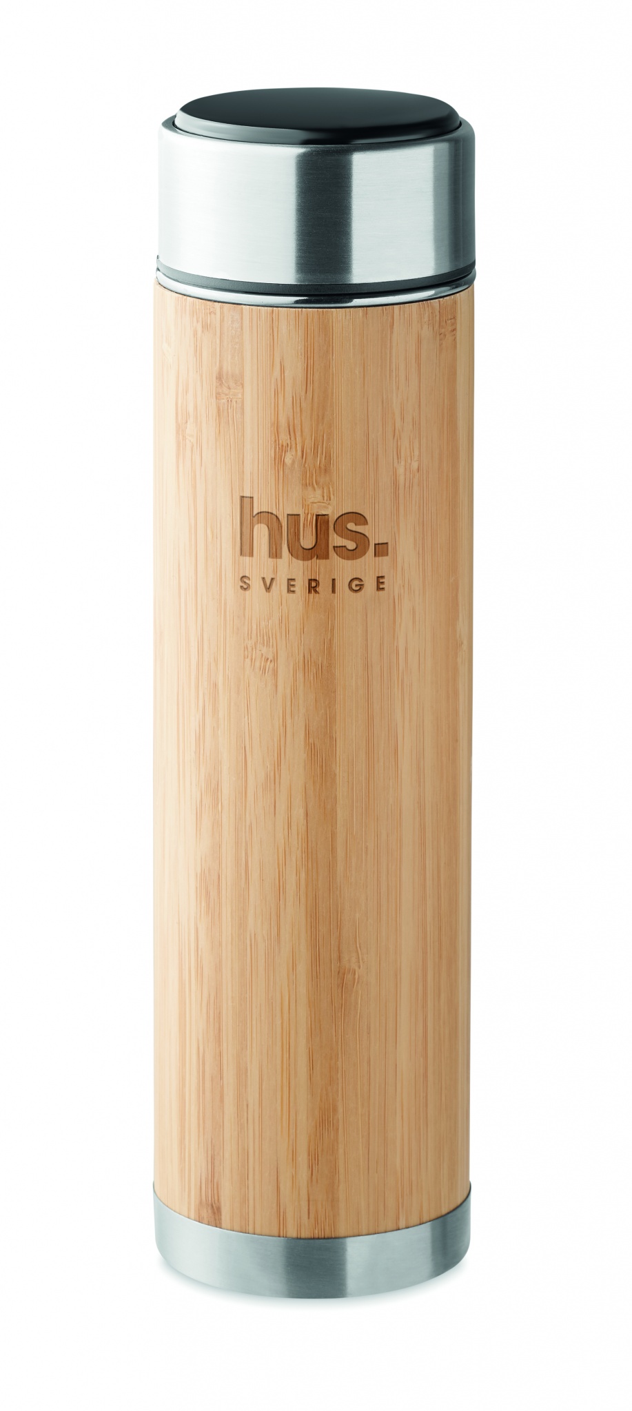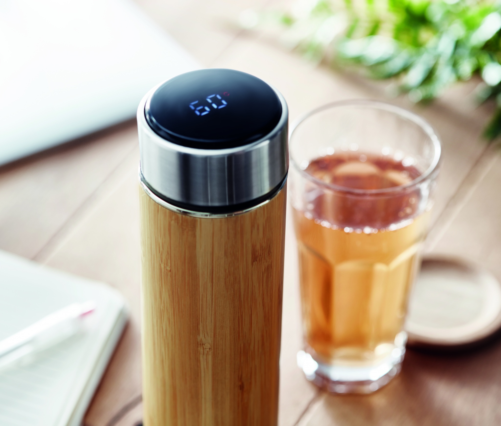 Double wall stainless steel/bamboo insulating vacuum flask with tea infuser inside. Includes LED touch thermometer in the lid. 1 replaceable CR2032 battery included. Capacity: 480 ml. Leak free. Bamboo is a natural product, there may be slight variations in colour and size per item, which can affect the final decoration outcome.