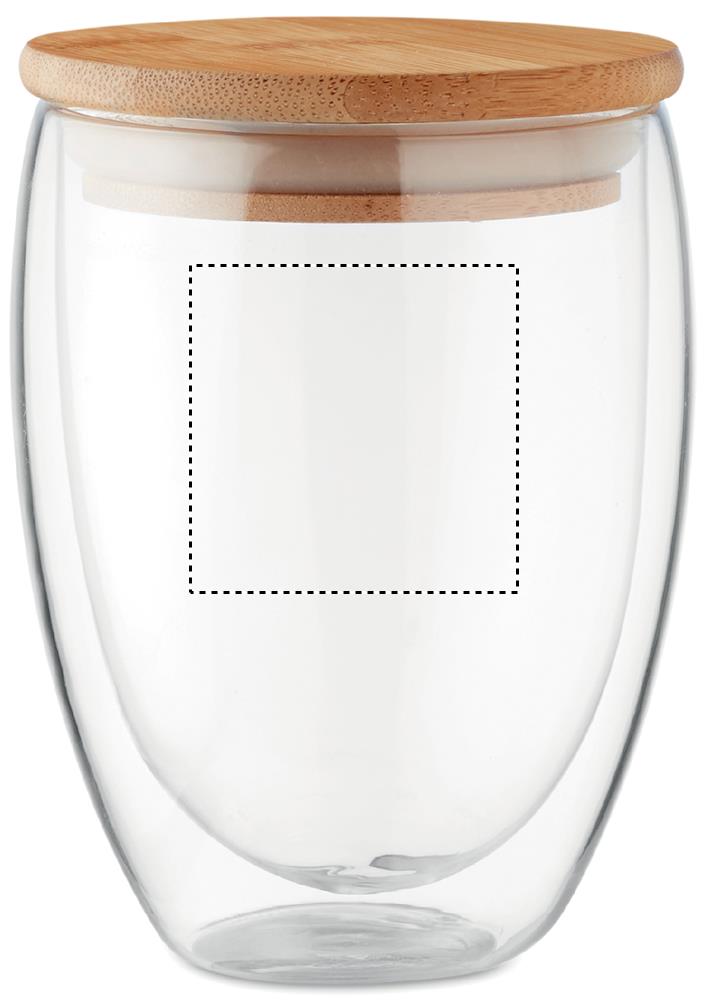 Double wall high borosilicate glass with bamboo lid with silicone ring. Capacity 350 ml. Bamboo is a natural product, there may be slight variations in colour and size per item, which can affect the final decoration outcome.
