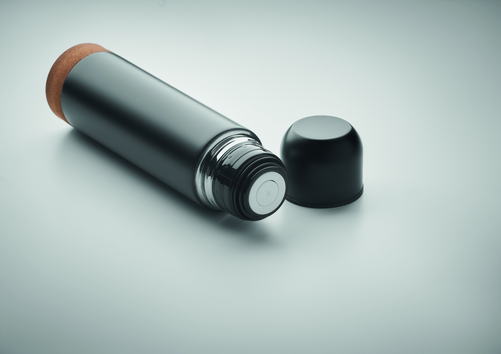 Double wall vacuum insulated flask in recycled stainless steel (90% recycled stainless and 10% stainless steel) with cork detail base. Leak- free. Capacity: 500 ml.