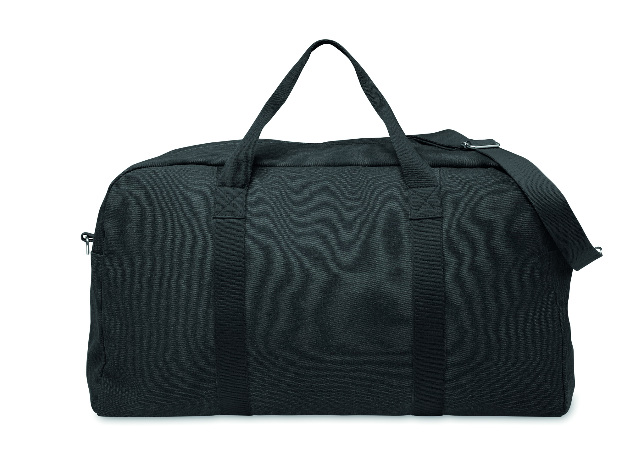 Duffle travel bag in recycled 450 gr/m² fabrics (60% recycled cotton and 40% recycled polyester) with adjustable and detachable cotton strap.