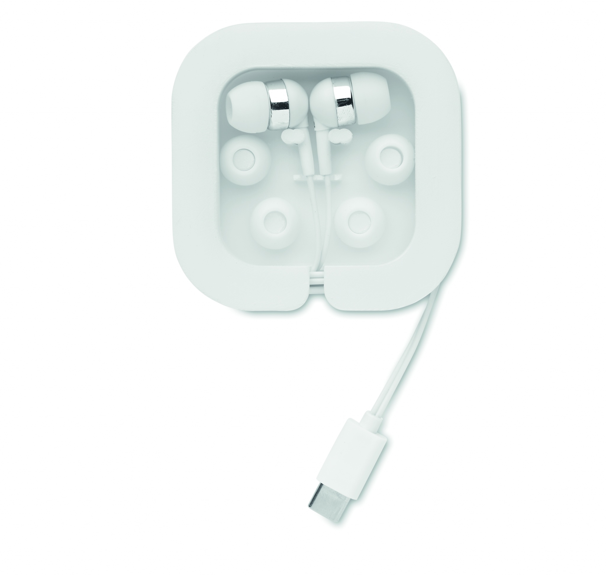 Silicone covered earphones that help to insulate against external noise for an improved sound quality. Phone-stand function. Presented in a plastic box where the 120 cm cable can be properly stored. 3 spare silicone covers in different sizes included. Connector: Type-C.