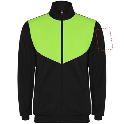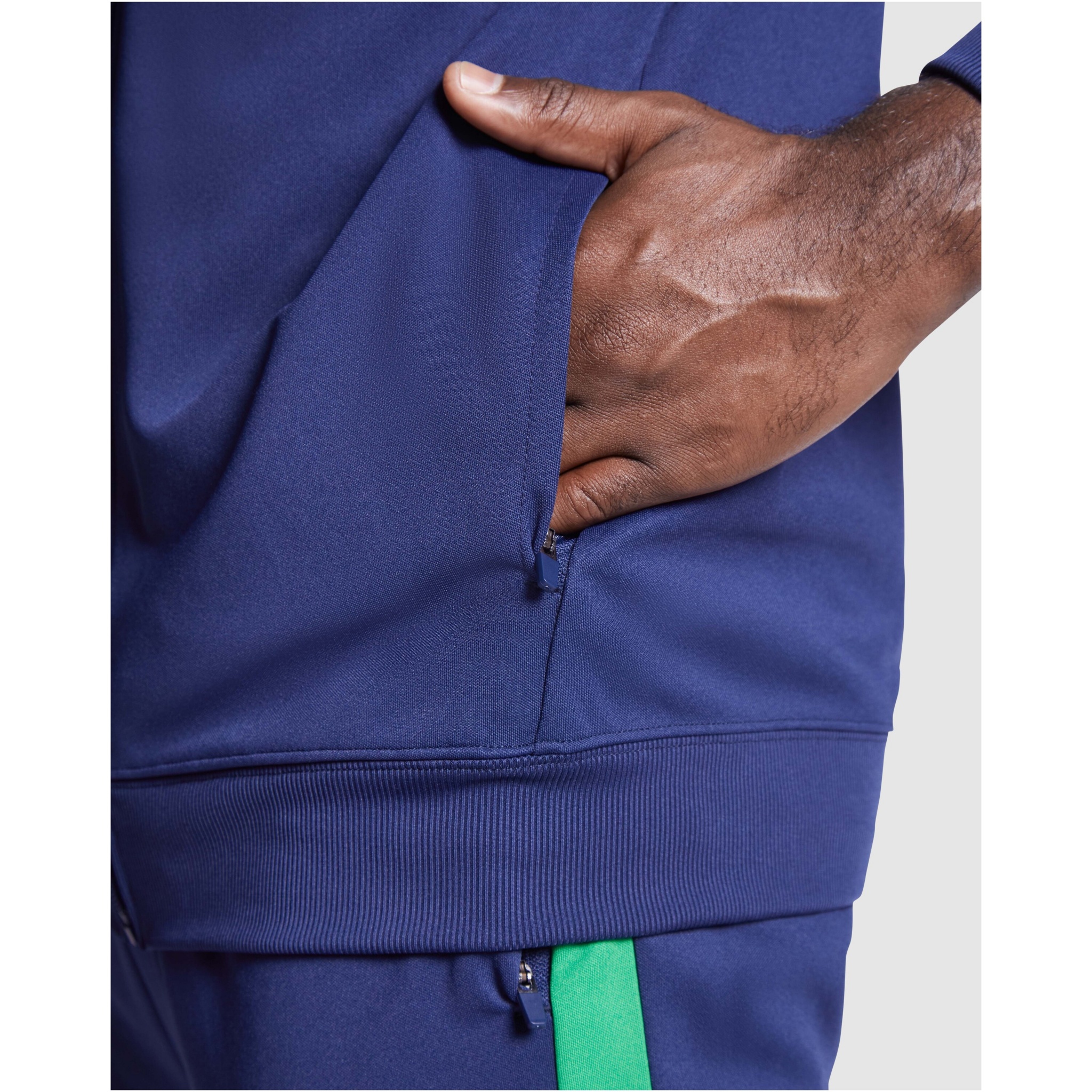 Tracksuit in lightweight and elastic fabric. Jacket with contrasting colour and sewing trims on the chest. High collar with contrasting seams. Center front zip. Side pockets. 2x2 ribbed cuffs and waist. Trousers with elastic waistband and drawstring. Contrasting side piece with sewing trim. Zipped hem.
