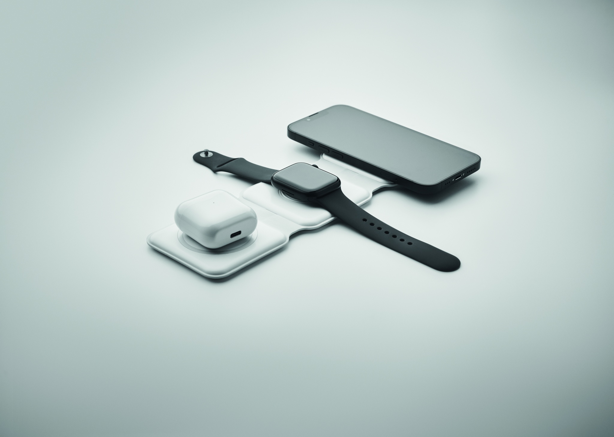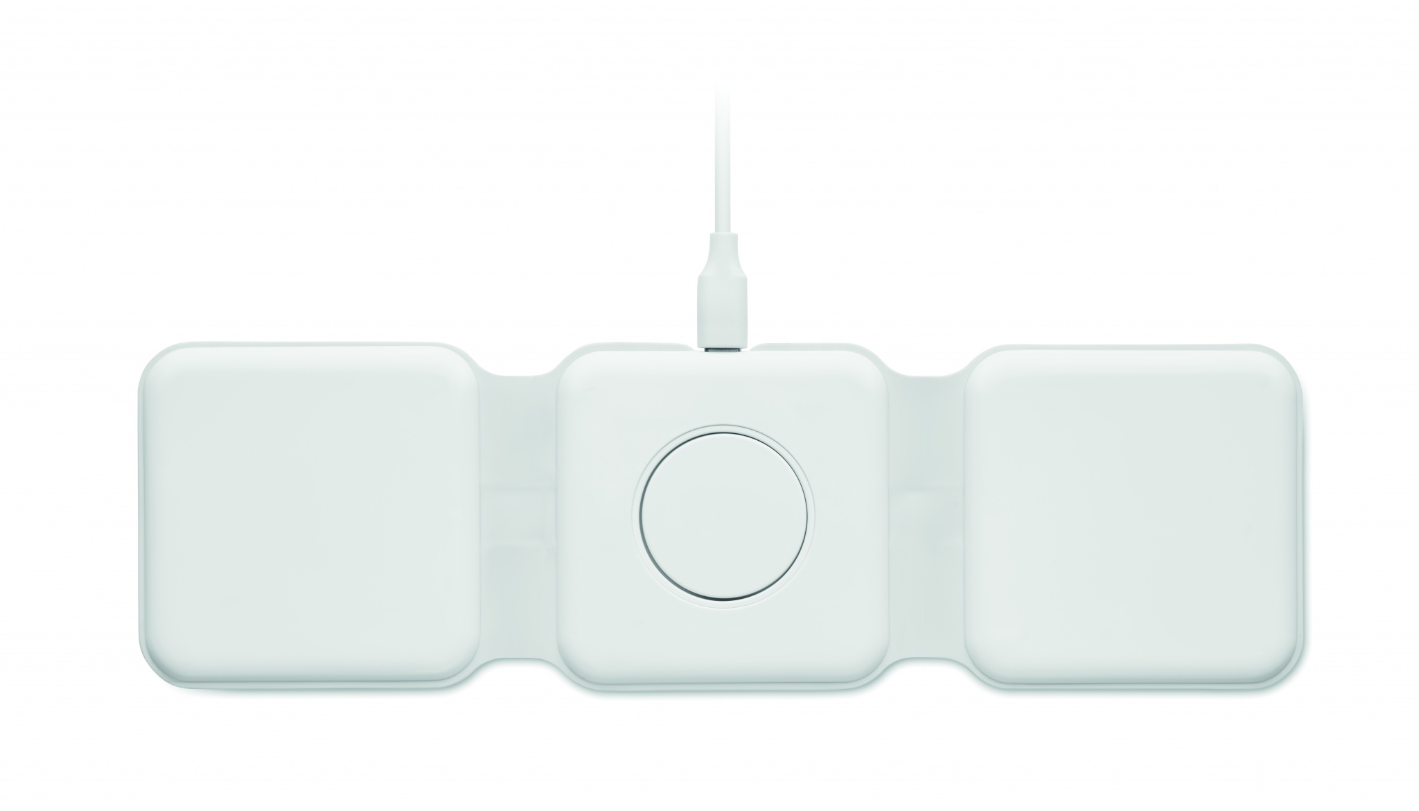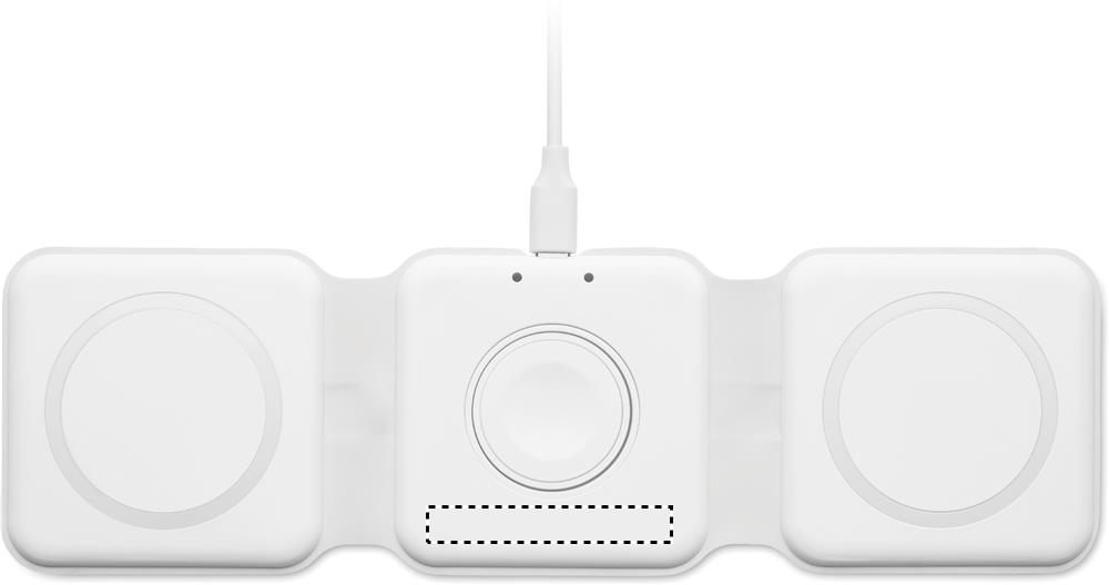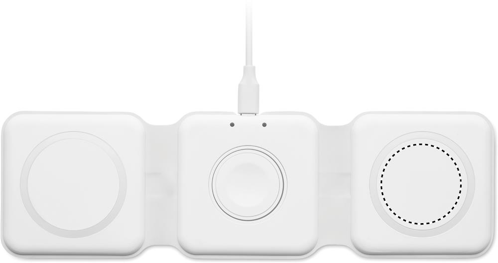 3 in 1 foldable charging station in ABS. It has 3 wireless charging spots (15W). Input: 2-in-1 Type-C and Type-A. Compatible with all QI enabled devices such as latest Androids, iPhone® 8, X and newer. Also compatible with iWatch.