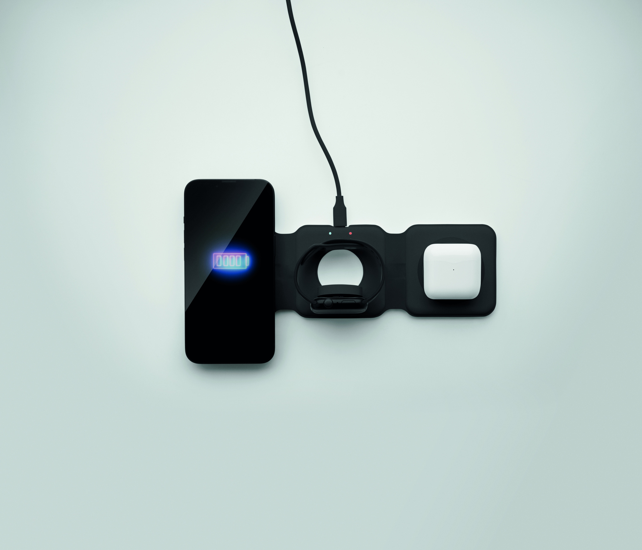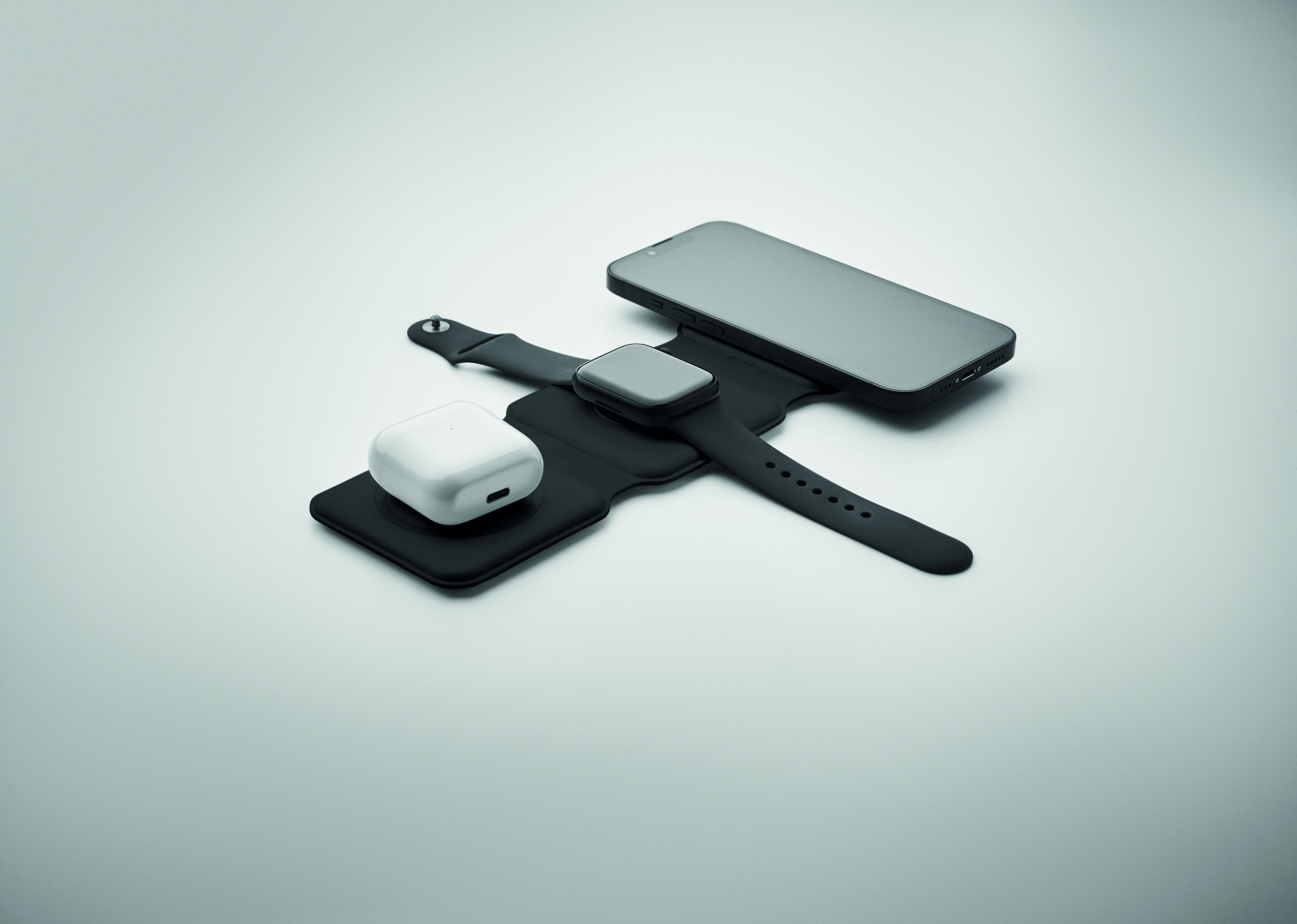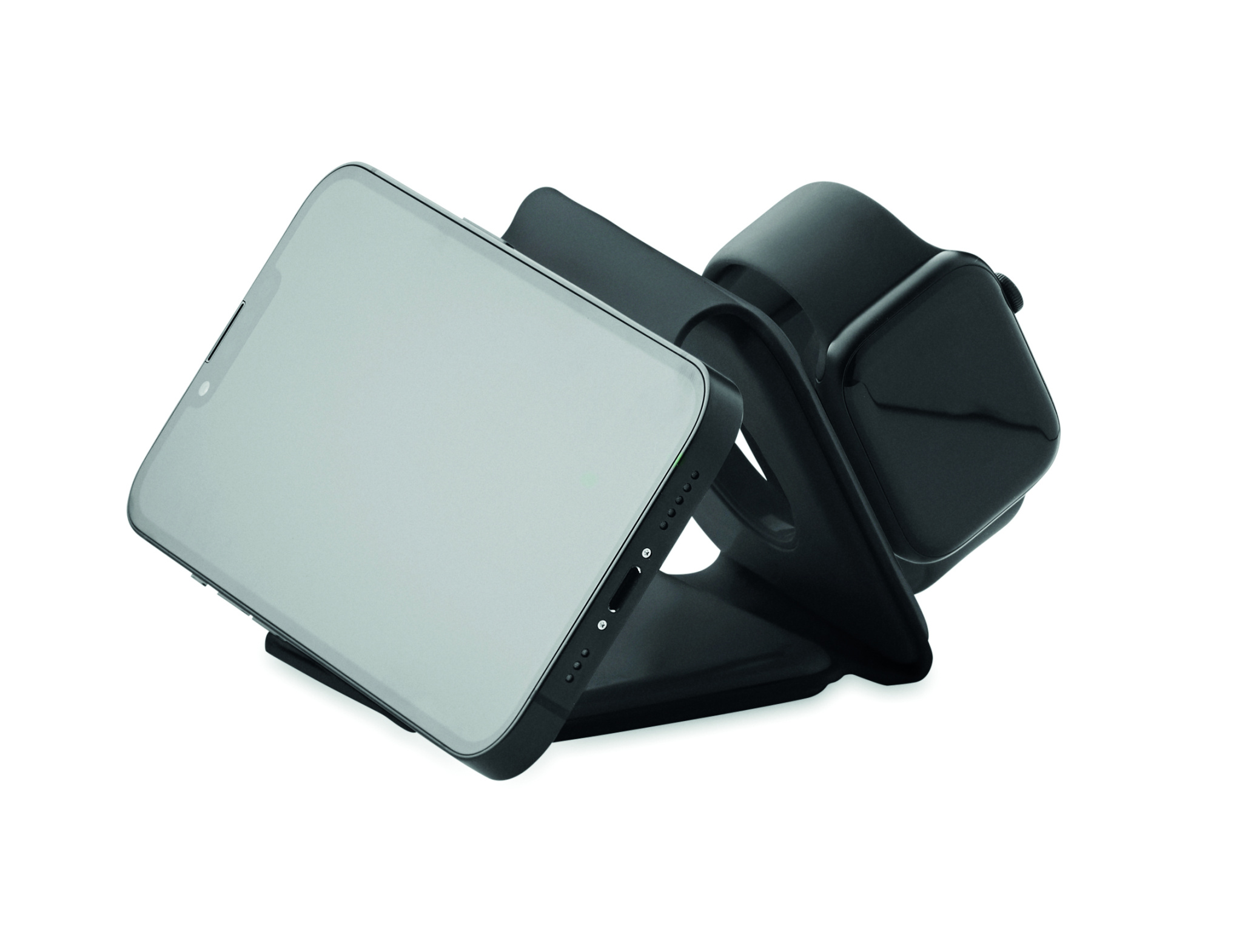 3 in 1 foldable charging station in ABS. It has 3 wireless charging spots (15W). Input: 2-in-1 Type-C and Type-A. Compatible with all QI enabled devices such as latest Androids, iPhone® 8, X and newer. Also compatible with iWatch.