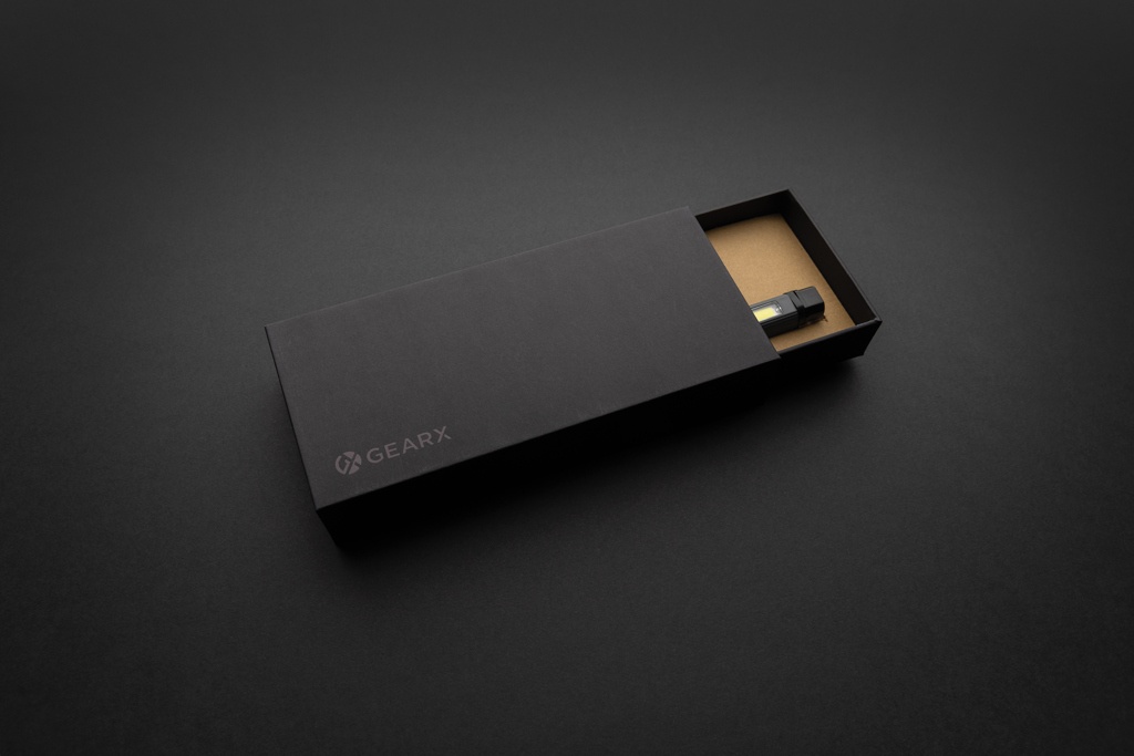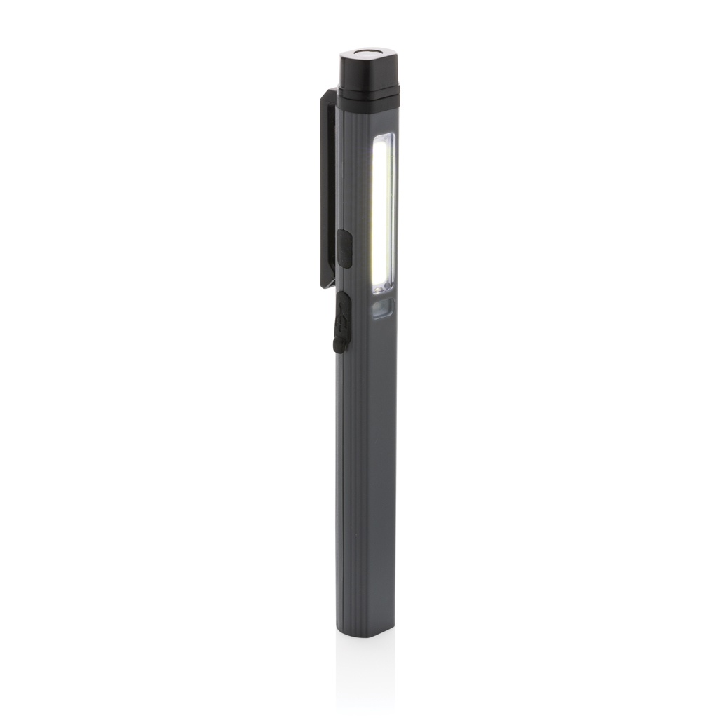 Pocket size pen light with super bright COB, LED and blue light made with RCS certified recycled ABS plastic. Total recycled content: 33% based total item weight. RCS certification ensures a completely certified supply chain of the recycled materials. The work light uses a re-chargeable A-grade 460 mah lithium battery so no need to replace the batteries. Simply re-charge via your USB socket. The work light comes with 260 lumen COB, 80 lumen LED and blue light. With 4 modes:COB, COB 50%, LED light and blue light. With clip on the back. With type C port for re-charging. Operating time on one charge: 3 hours.