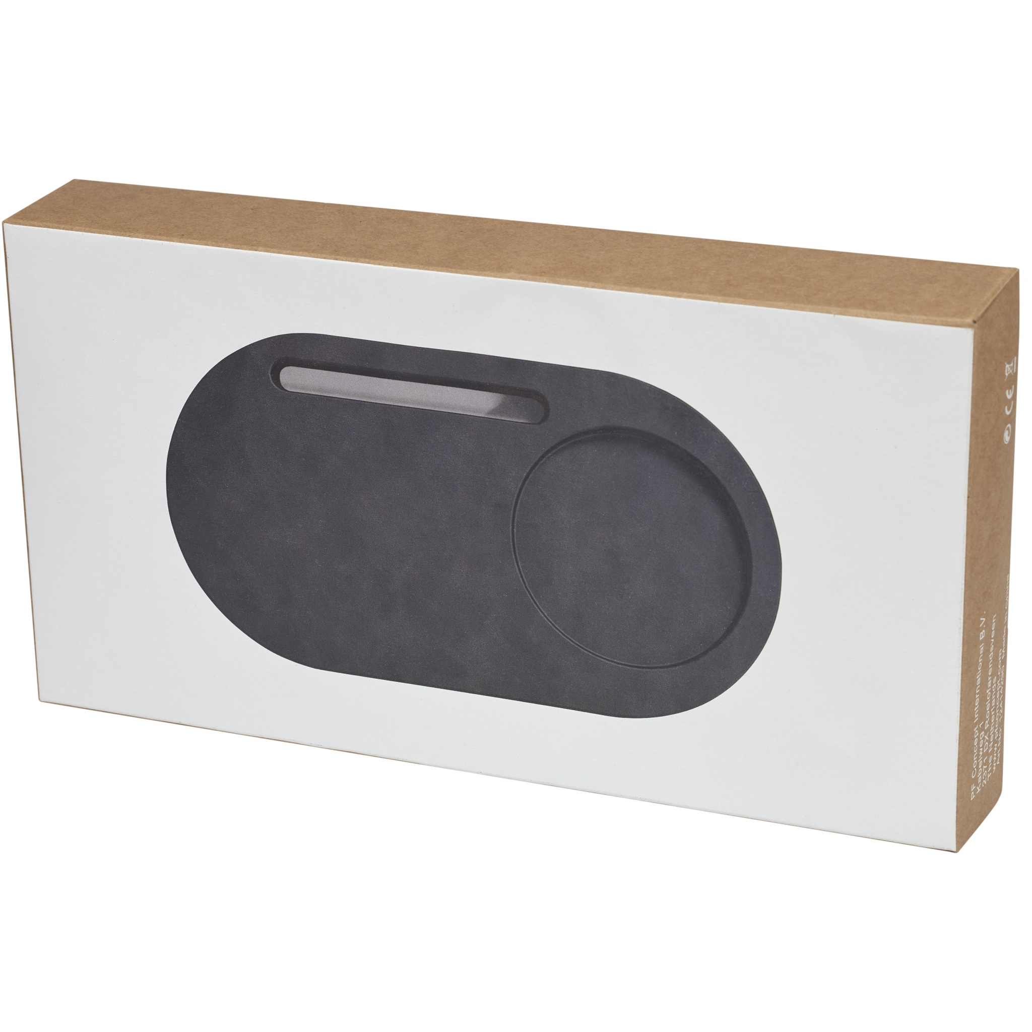 5W wireless charging desk organizer made of a combination of natual limestone and cork. To charge a device without wireless technology, an external wireless charging receiver or receiver case is required. Packaged in a gift box and delivered with an instruction manual (both made of sustainable material). Includes a 100 cm USB cable.