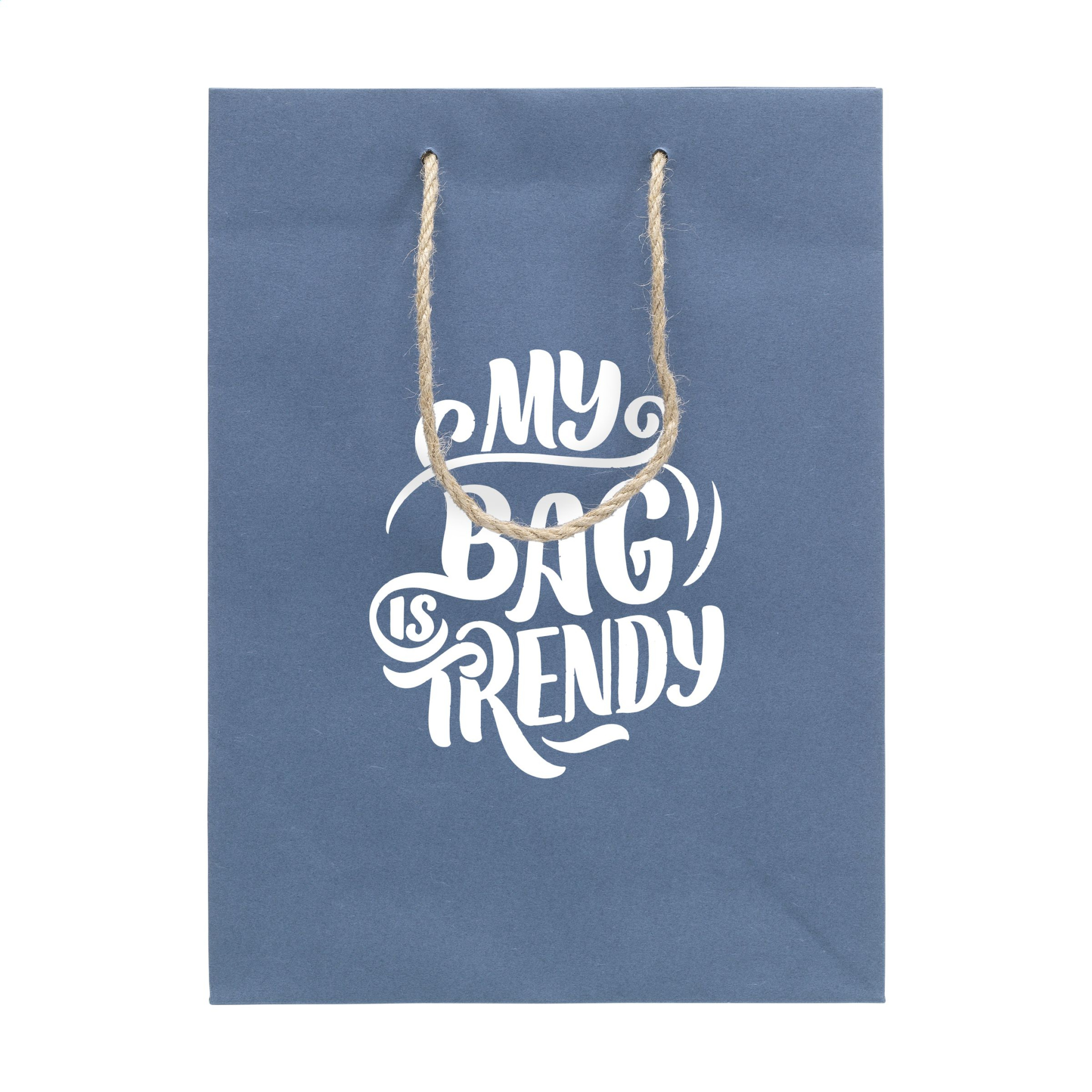 WoW! Sturdy ECO gift bag (size M) made from recycled paper with jeans fibres (180 g/m²). Due to using recycled jeans fabrics, the shade of blue can differ per bag. The blue colour gives the bag a trendy look. The bag has two short jute carrying loops, a folded bottom and a side fold. Suitable for all kinds of promotional purposes. No trees are cut down for the production of this bag.