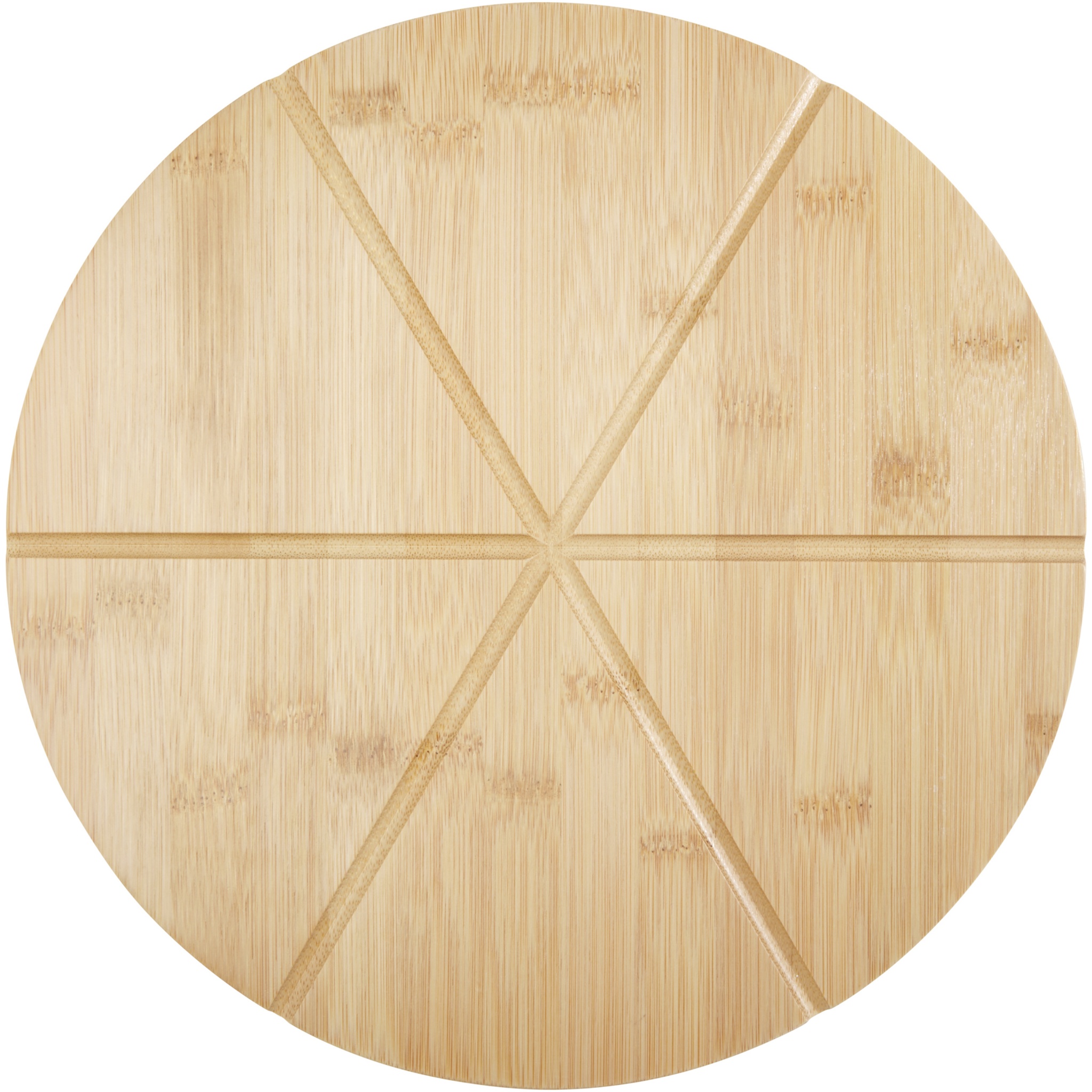 Bamboo pizza peel with 6 grooves to slice and portion, a pizza cutter and a pizza server. The bamboo used is sourced and produced following sustainable standards.