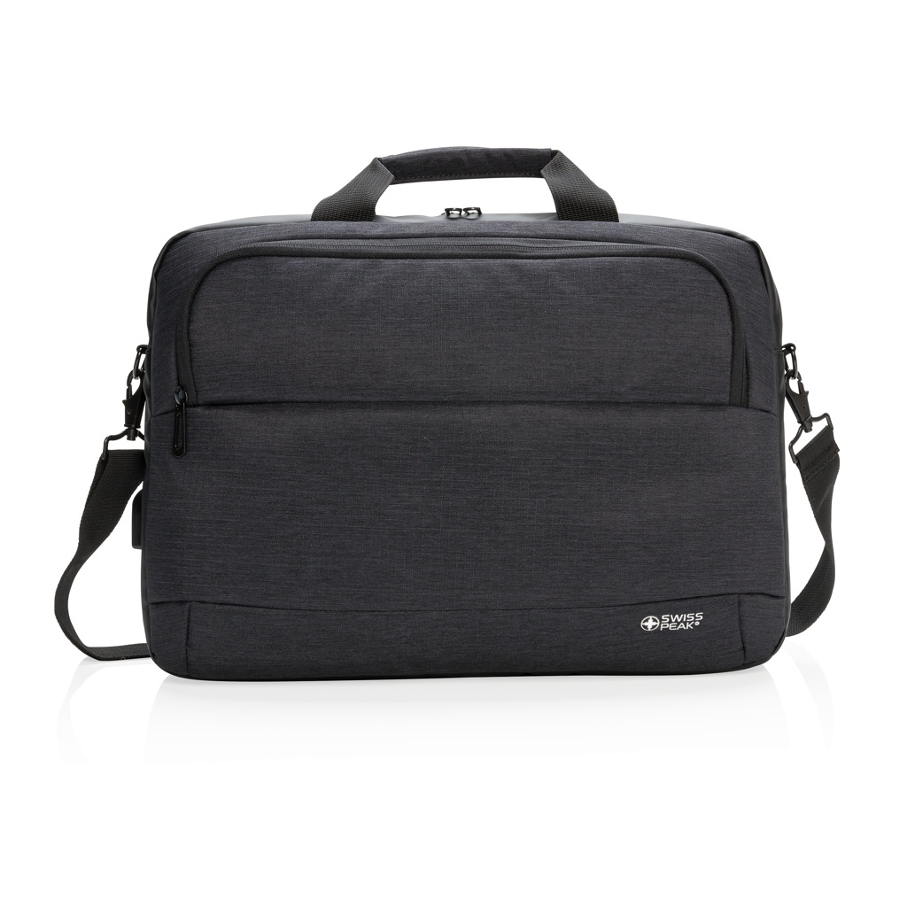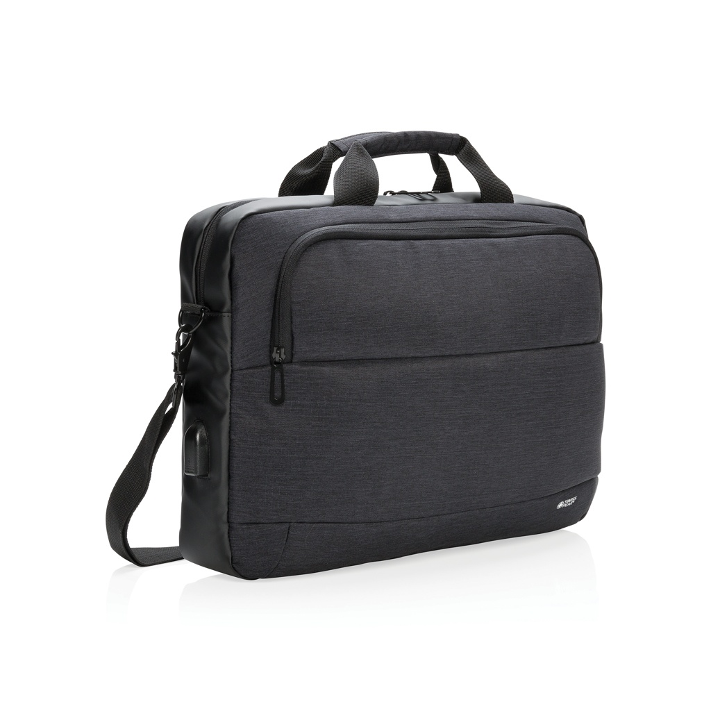 Fashionable 15” laptop bag in two tone polyester with PU. Designed with one large main compartment for your laptop and one front compartment. Connect your powerbank easily to the integrated USB charging port and charge your phone or tablet on the go. With shoulder strap and trolley strap on the back.