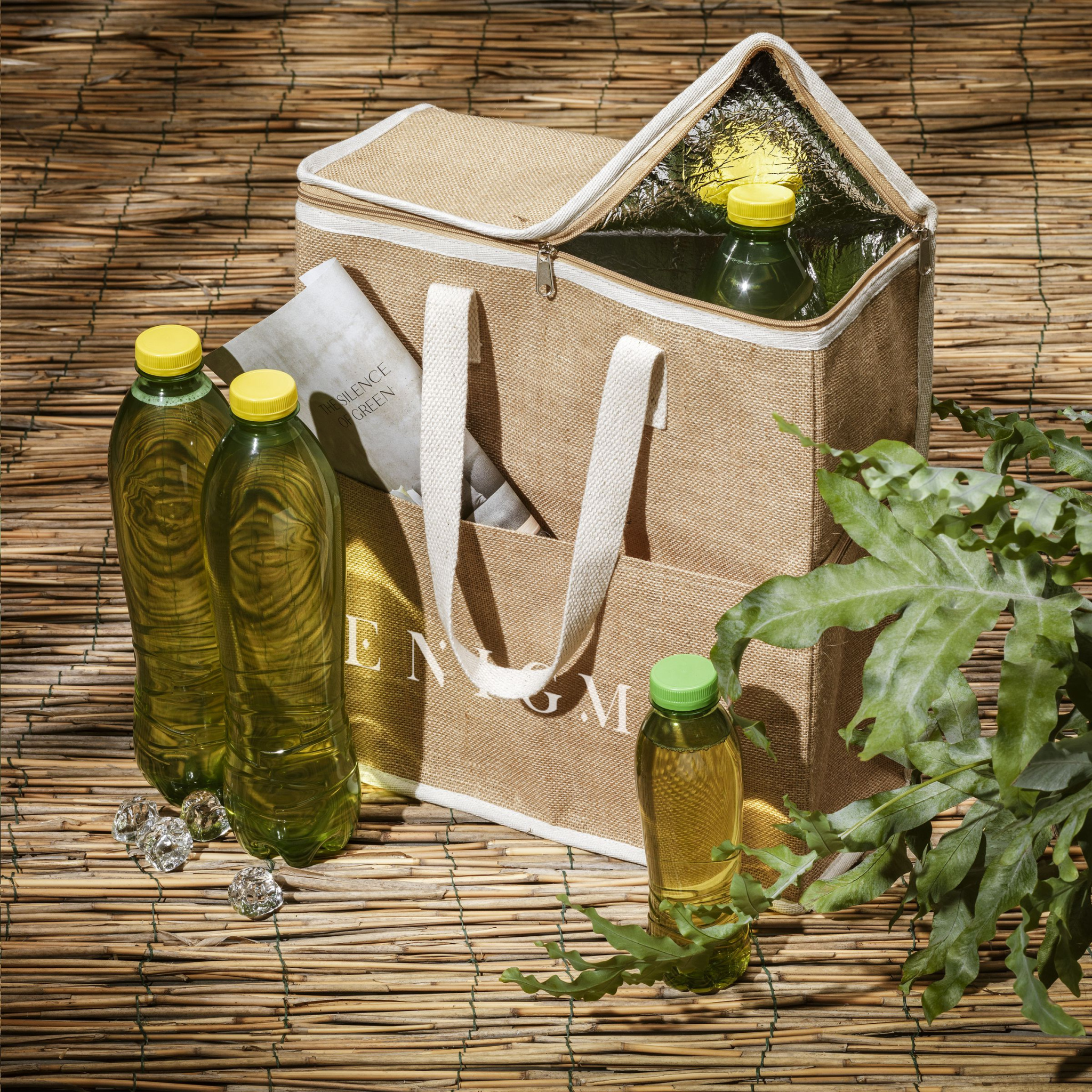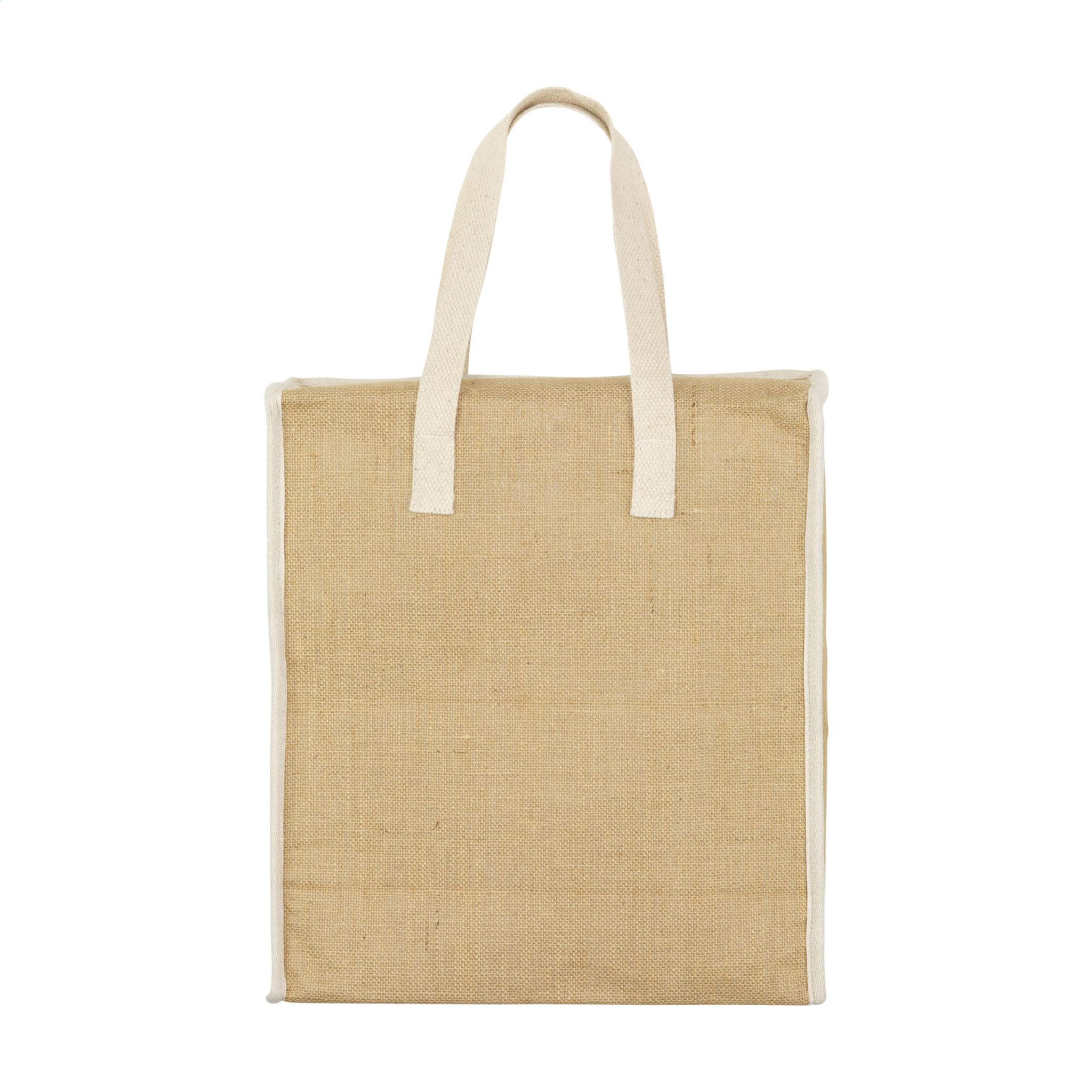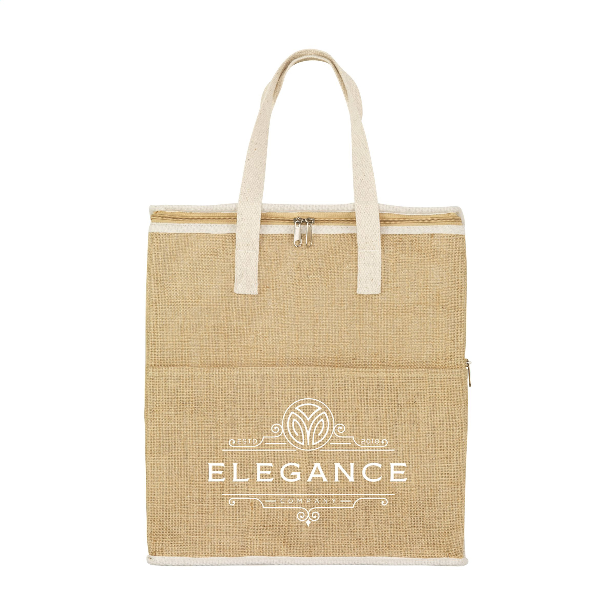 WoW! This cooler bag made from a combination of sturdy jute and cotton material with insulated inner. Keep your food and drinks cool during a day out in this very spacious cool bag. This bag has a zip closure and front pocket offering extra storage space. These extra pockets are handy for storing things that don't need to be cooled, such as your phone or wallet. Supplied with woven cotton handles. Capacity approx. 24 litres.