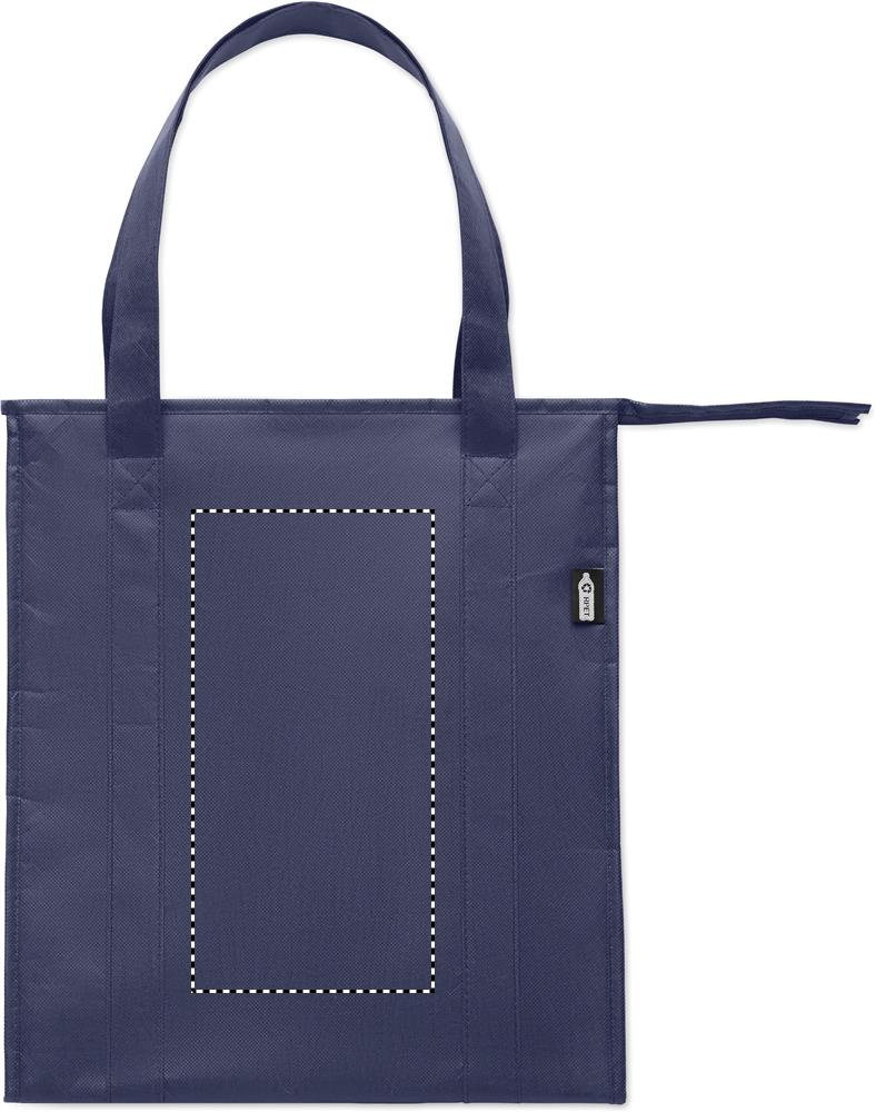 Cooler bag in RPET non-woven 80gr/m². Isolation material: aluminium foil. Capacity 25L. Main compartment with zipper on top.
