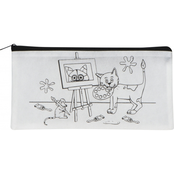 Non-woven pencil case with five crayons (yellow, black, blue, red, and green), printed with a cheerful design for coloring. Ideal for keeping children entertained and fostering their imagination.