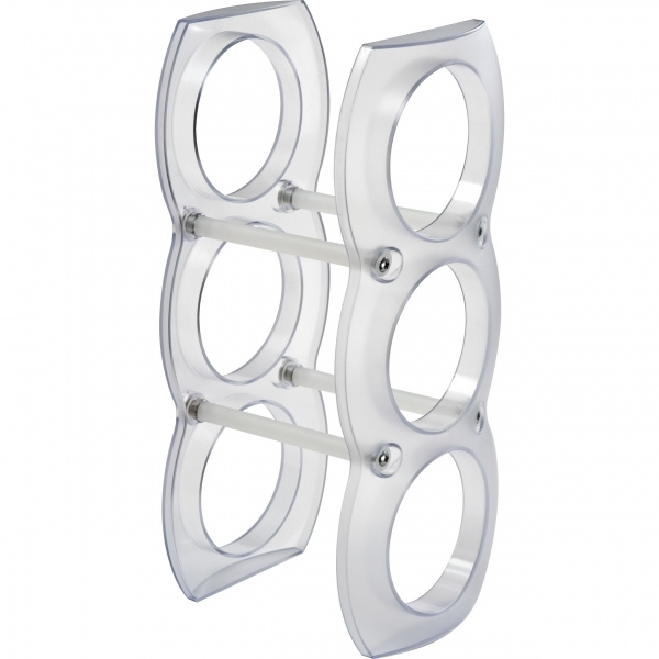 This frosted plastic wine rack provides space for three bottles and fits even into the smallest flat thanks to its comfortable size; includes screws and instruction manual. We will print your logo on the rack.