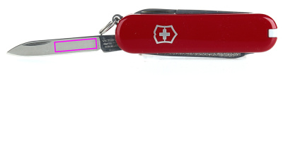Thanks to its small size, the Classic SD pocket knife is perfect as a very practical keychain.Features: 1.small blade for cutting, 2.pair of mini scissors, 3.nail file 4.with a screwdriver tip, 5.toothpick, 6.tweezers, 7.key ring