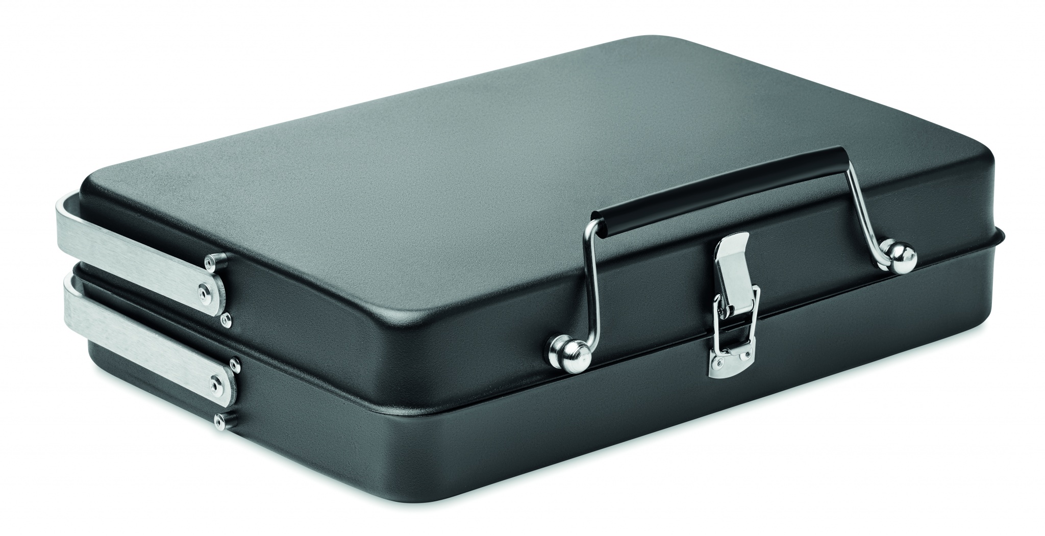 Stainless Steel portable suitcase barbecue with layer grill and stand at the bottom.