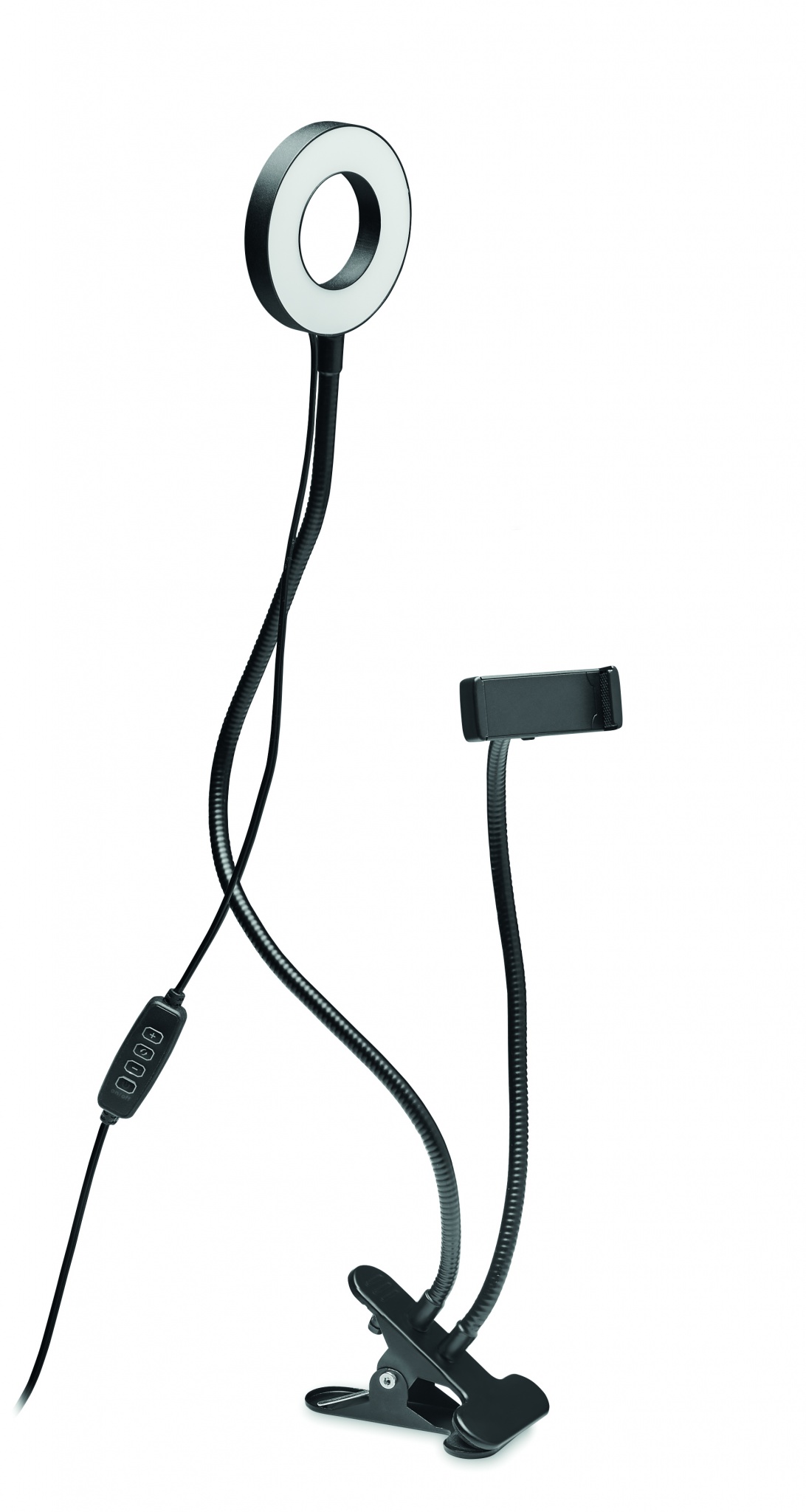 24 cm LED portable selfie ring light with phone holder and clip. Ideal for tik-tok®, live-streaming, broadcasting and photography. White, warm, light with 3 brightness levels.