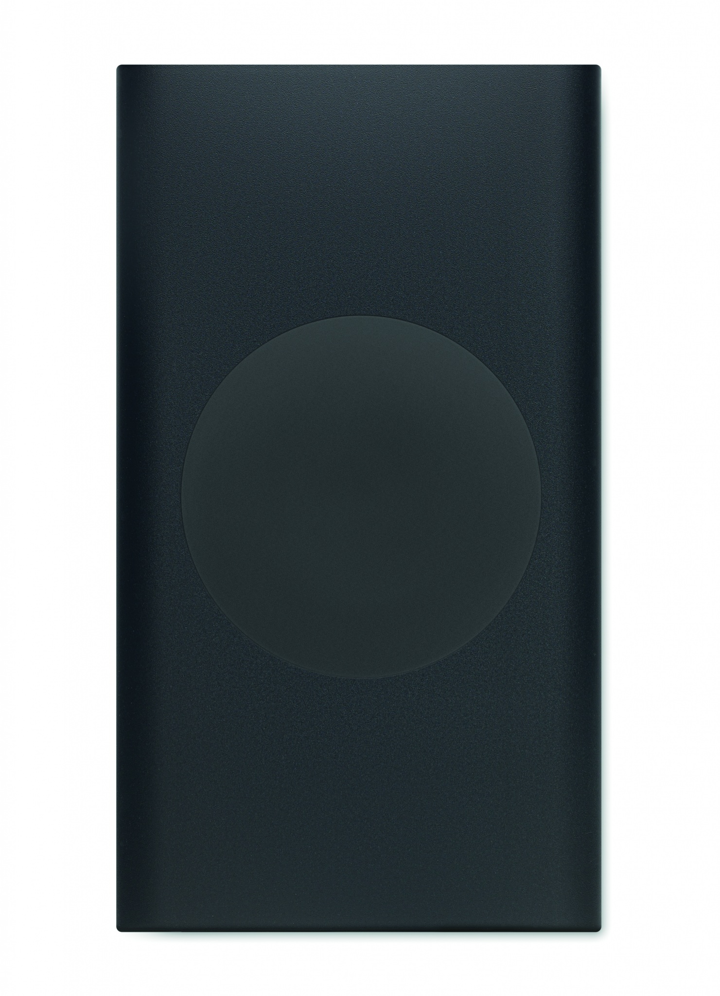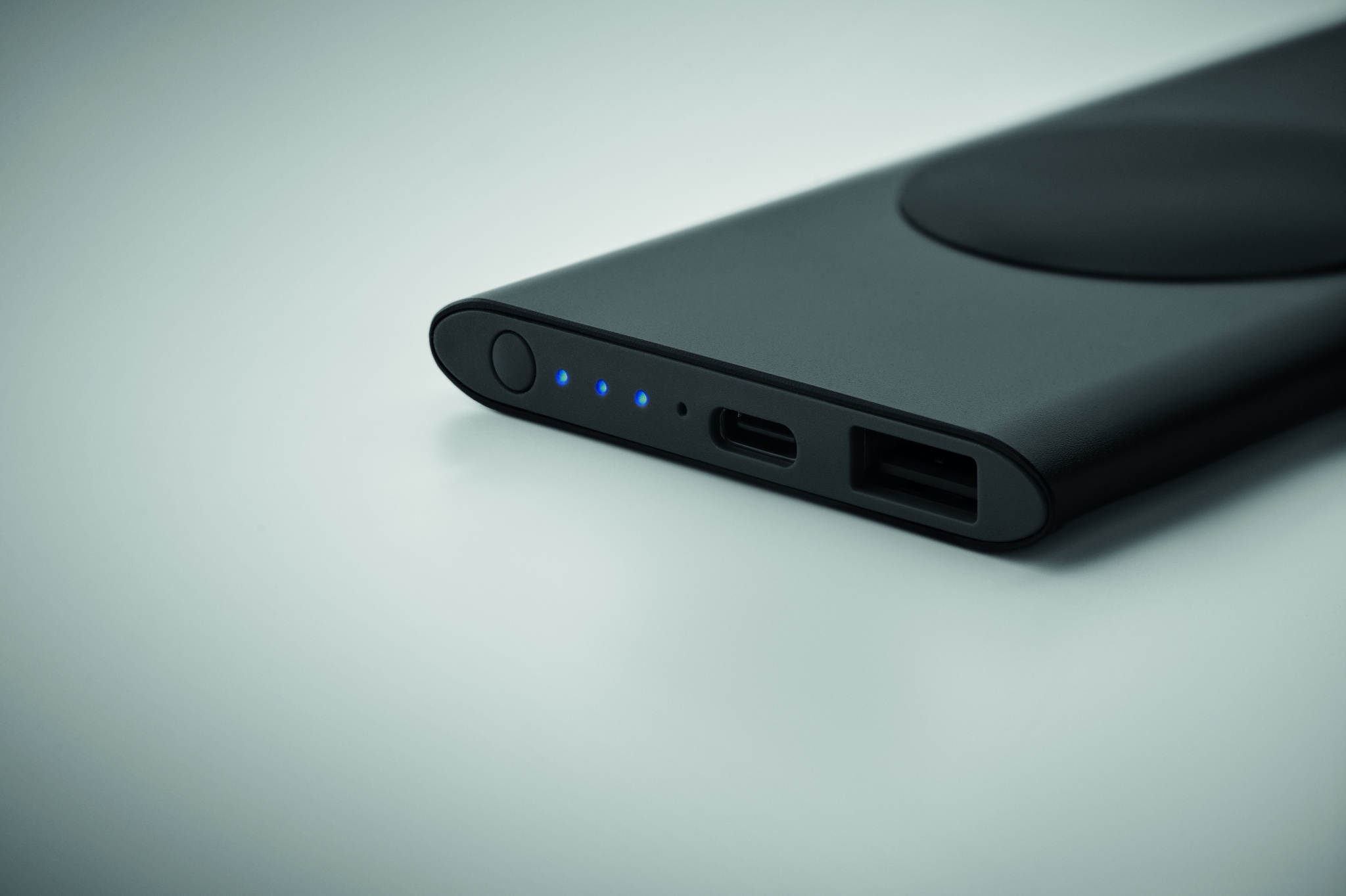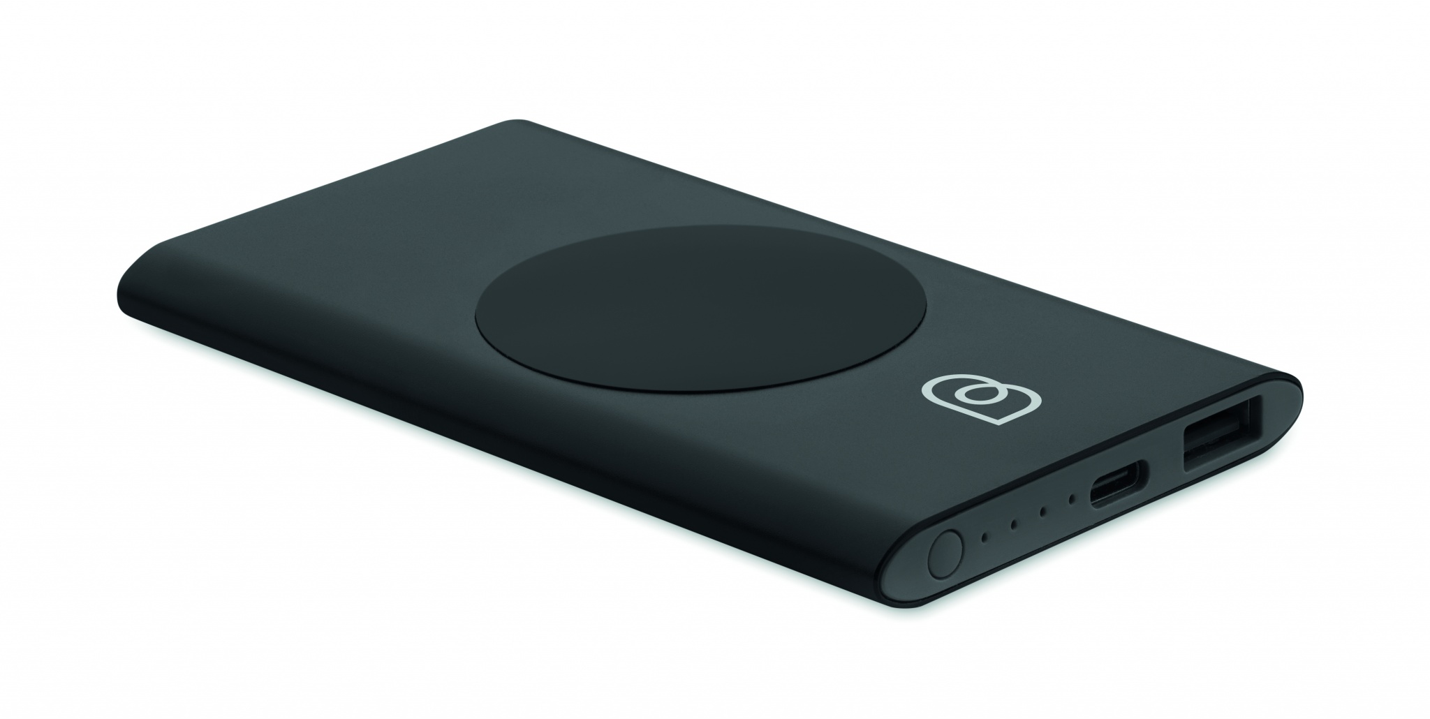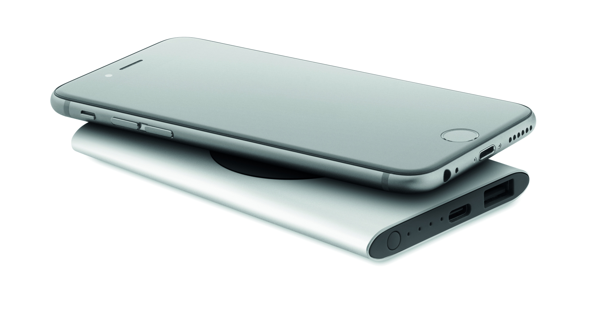 Wireless 15W charging 5000 mAh power bank in recycled aluminium. Input: Type-C. Output: 1 x Type-C & 1 x Type-A. Compatible latest androids, iPhone® 8, 8S and X and newer.
