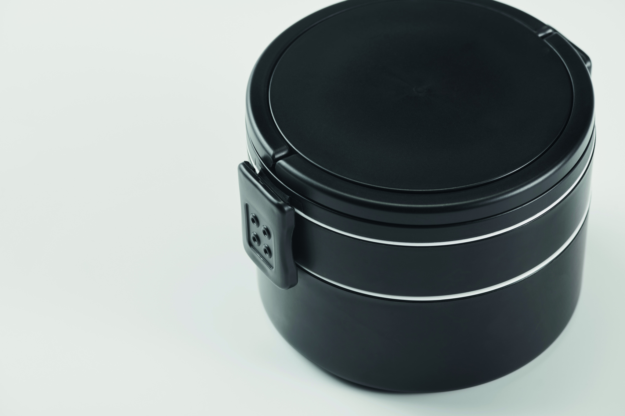 Two-tier round lunch box made of PP with side clip closure and handles. Includes inner lids in white. Capacity 250 ml top, 700 ml bottom.