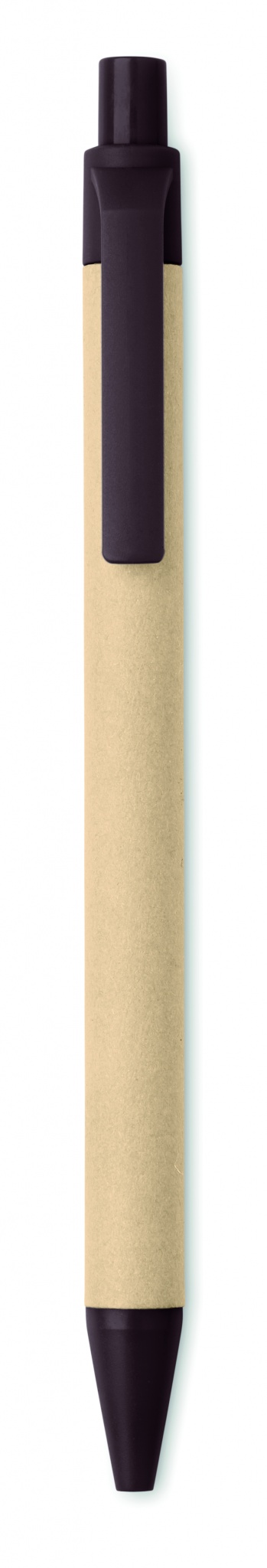 Push button paper barrel ball pen with parts made of 40% coffee husk and 60% ABS. Blue ink.