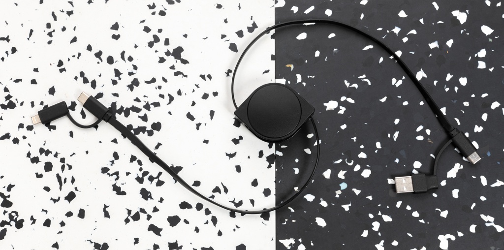 6-in-1 retractable cable where the case is made out of RCS certified recycled ABS plastic and the wire from recycled TPE. Total recycled content: 59% based on total item weight. RCS (Recycled Claim Standard) is a standard to verify the recycled content of a product throughout the whole supply chain. RCS is the standard that is used when a part of the item has been made from recycled materials. The cable has 5 different connectors: USB C in, USB A in, type C out, IOS out and micro USB out. This allows you to use the cable with type C output devices that are included in the newer generation of phones and macbook computers. The cable also has a USB A output input option so it can charge any device from any output source. Item is completely PVC free.